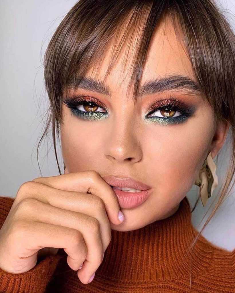 Бронзовый — один из самых универсальных оттенков для макияжа глаз. И, конечно, он особенно выразительно смотрится на карих глазах. Прокрашивай темными бронзовыми тенями нижнее и верхнее веко, мягко тушуя границы. Получится яркий знойный образ. Плюс ко всему ты можешь миксовать тени с мерцающей подводкой того же цвета, чтобы освежить свой образ.