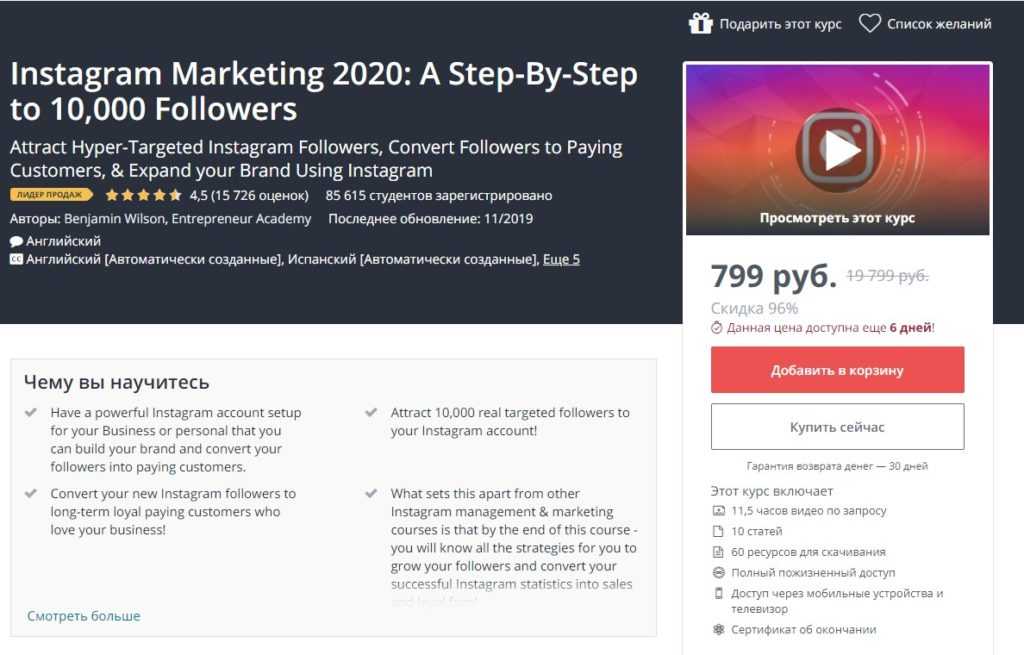 Как организовано обучение? На платформе Udemy, поэтому курс только для тех, кто уверенно владеет английским языком. Включает 11,5 часов видеоуроков, 10 статей, 60 дополнительных материалов. Курс регулярно обновляется с появлением новинок и трендов. А доступ при единовременной покупке остается пожизненный.