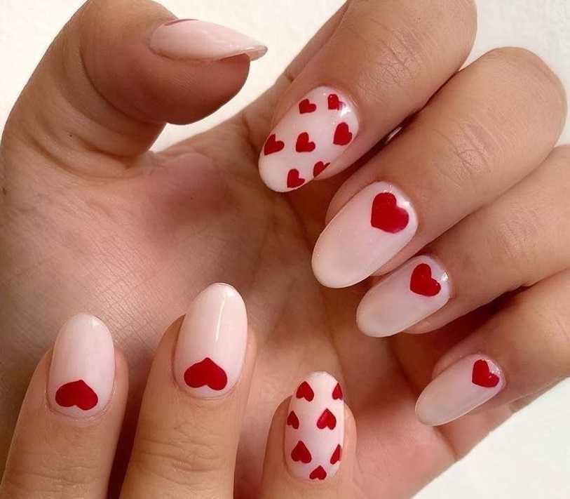 Сердца — это самый узнаваемый символ Дня святого Валентина. Потому сделать маникюр праздничным можно просто добавив их к дизайну. За основу берите однотонную базу и добавляйте мелкие сердечки. Это очень лаконичный дизайн, который подойдет даже для официальных луков.