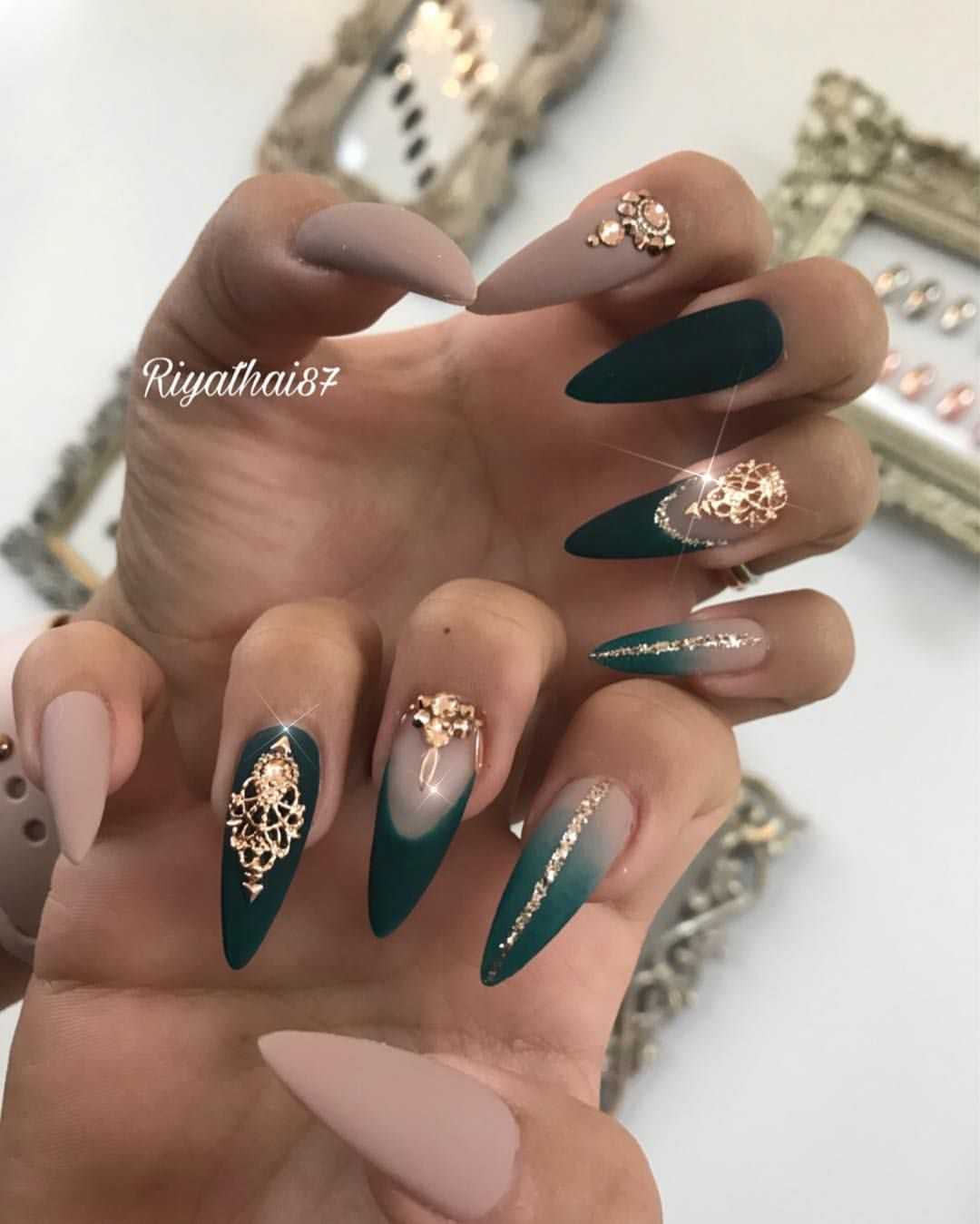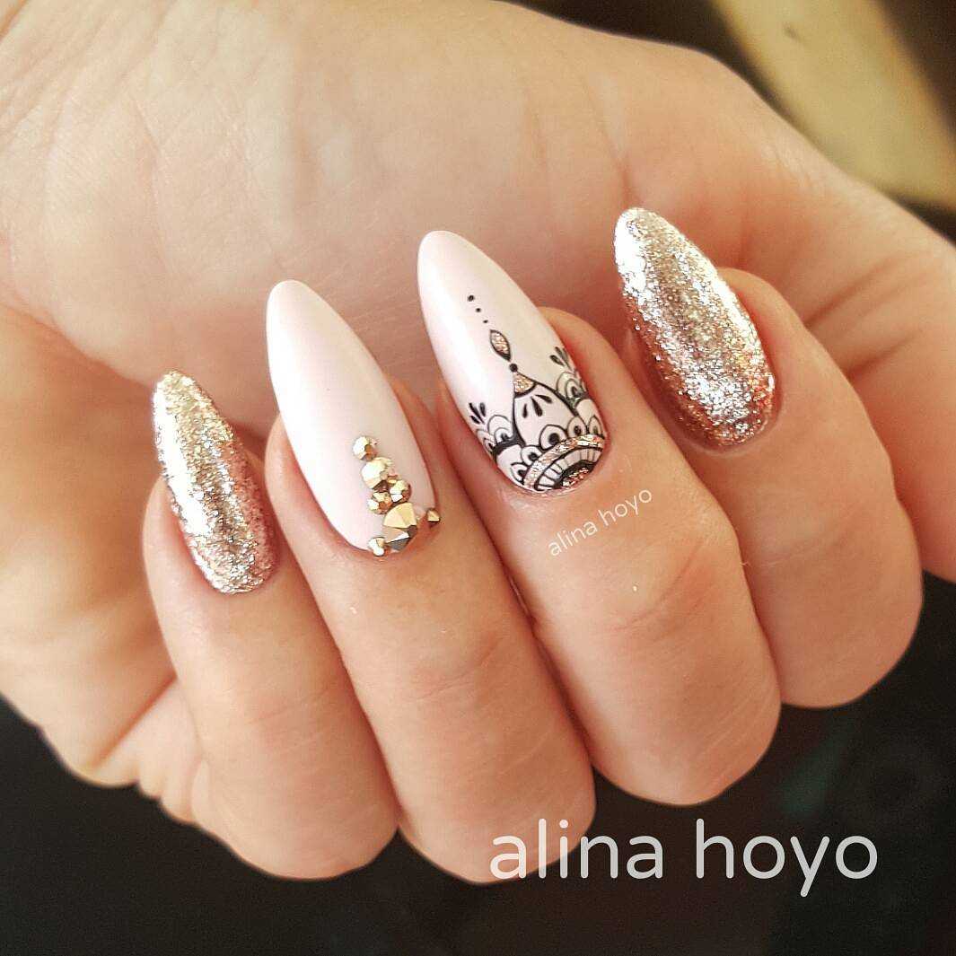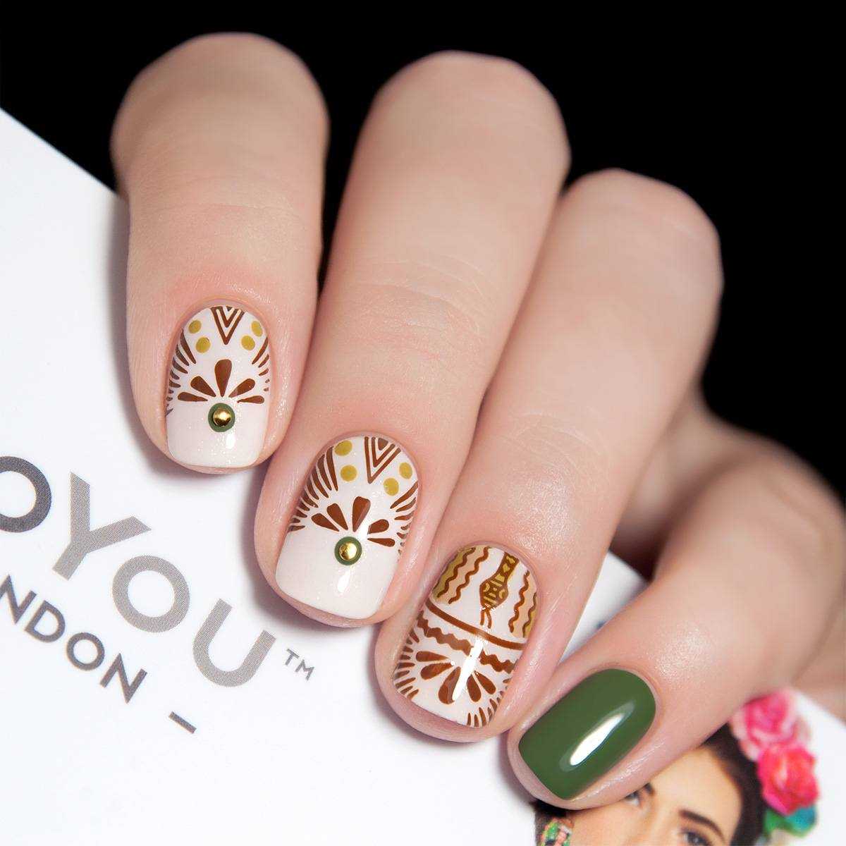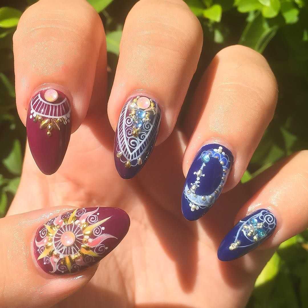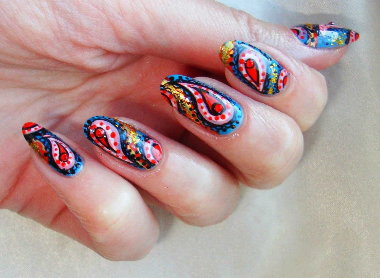 - индийский маникюр: узоры хной, павлиньи перья, кашемир или так называемые индийские огурцы.