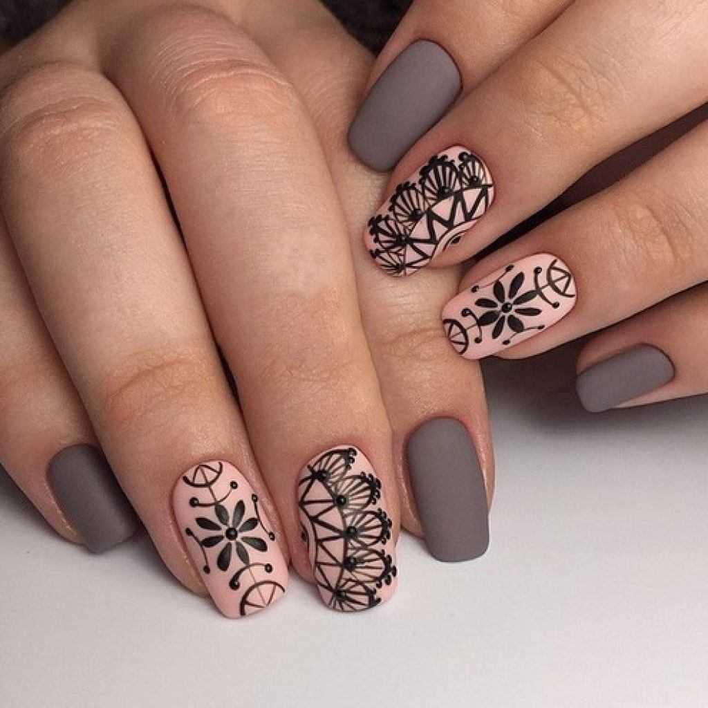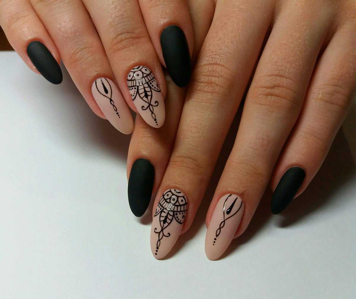 В маникюре мехенди преобладают кремовые, серые, розовые тона в качестве фона и черный цвет – для выполнения рисунка. Маникюр мехенди отлично смотрится с серебряным и золотым глиттером, который используется для выделения одного из ноготка. Великолепно смотрится маникюр в черно-белых тонах. Такой дизайн будет особенно заметен на белом фоне, смотреться сдержанно и лаконично, несмотря на необычный узор.
