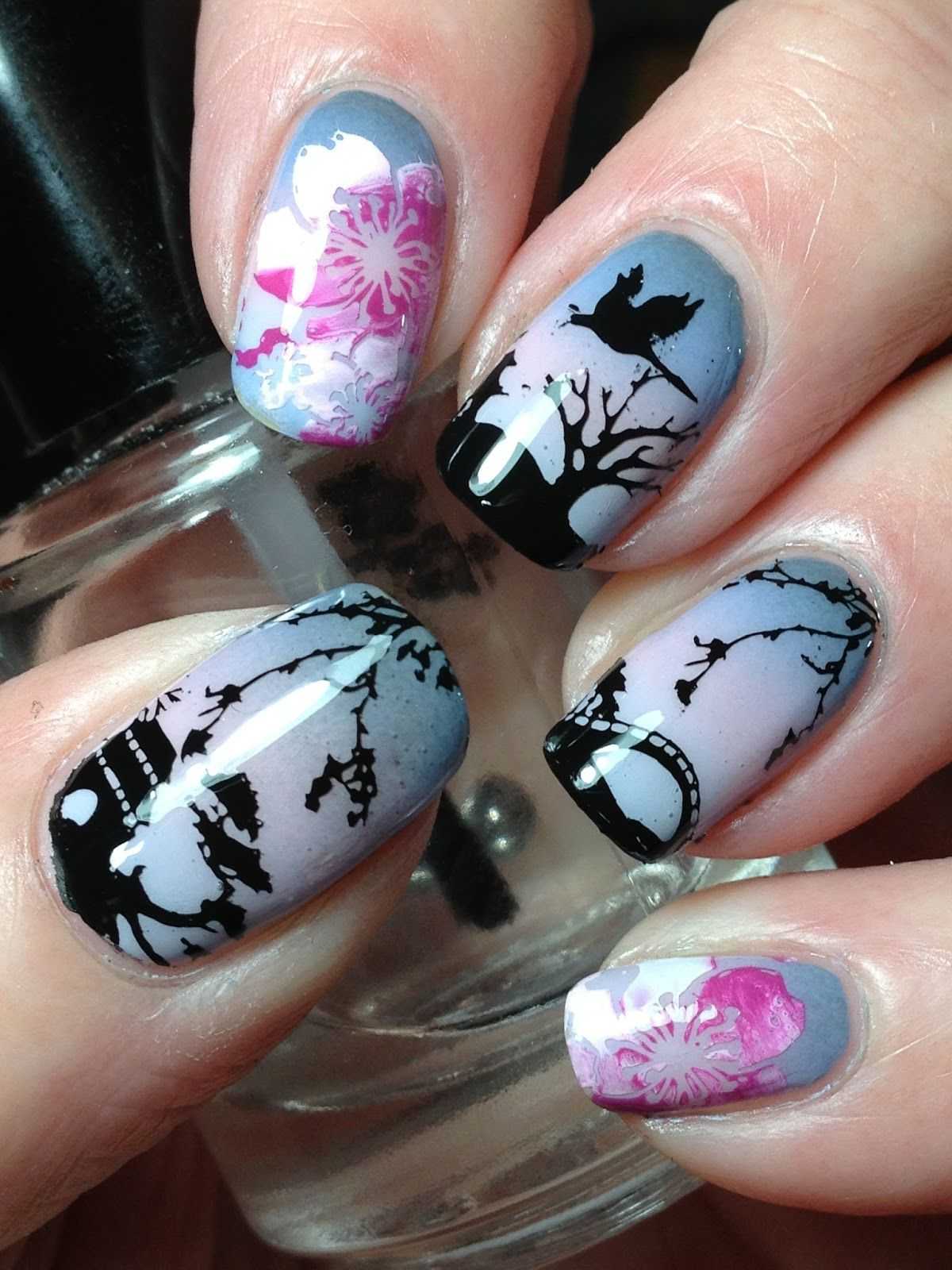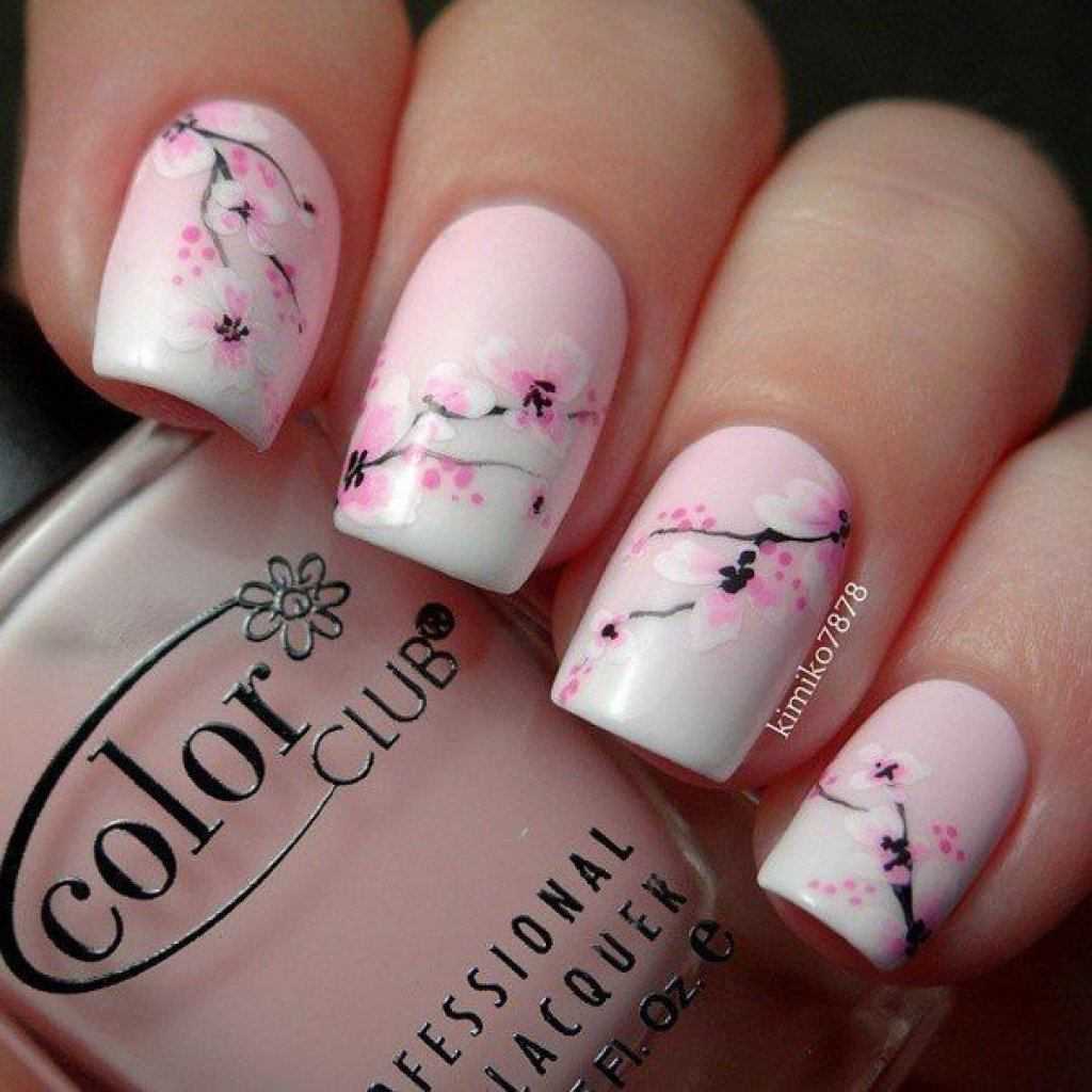 Маникюр с сакурой выполняется в розовом, малиновом, красном и других тонах. В качестве дополнения дизайна можно использовать изображение пагоды и иероглифов. Для выполнения этих узоров используются слайдеры или стемпинг. Сакура и другие японские мотивы красиво смотрятся на белом или другом светлом фоне. Дизайн должен получится очень нежным и женственным, как сама сакура, которая как известно считается символом женственности и скромности.