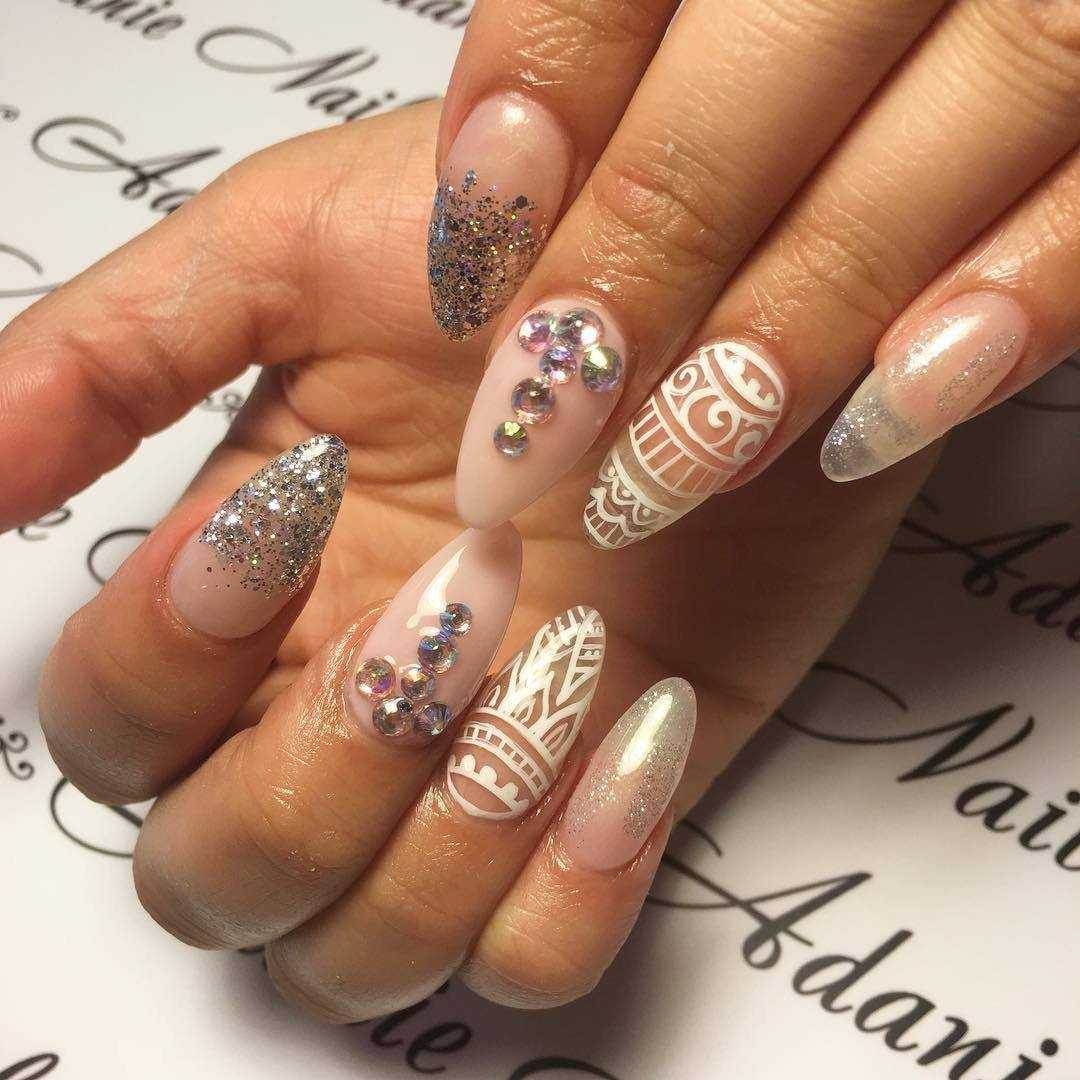 Добавьте серебристой фольги, стразов или глиттера, чтобы маникюр на миндальную форму ногтей приобрел праздничную тональность.