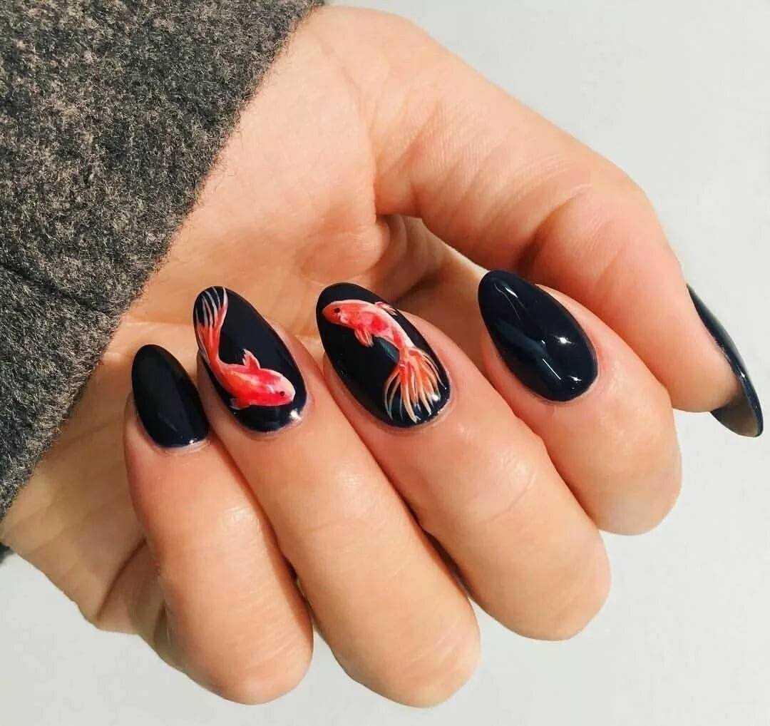 Красиво смотрится такая форма с нанесенной на нее аквариумной росписи. Это необычно, ярко, великолепно! Правда стоит учесть, что каждый день носить такой маникюр будет не уместно.