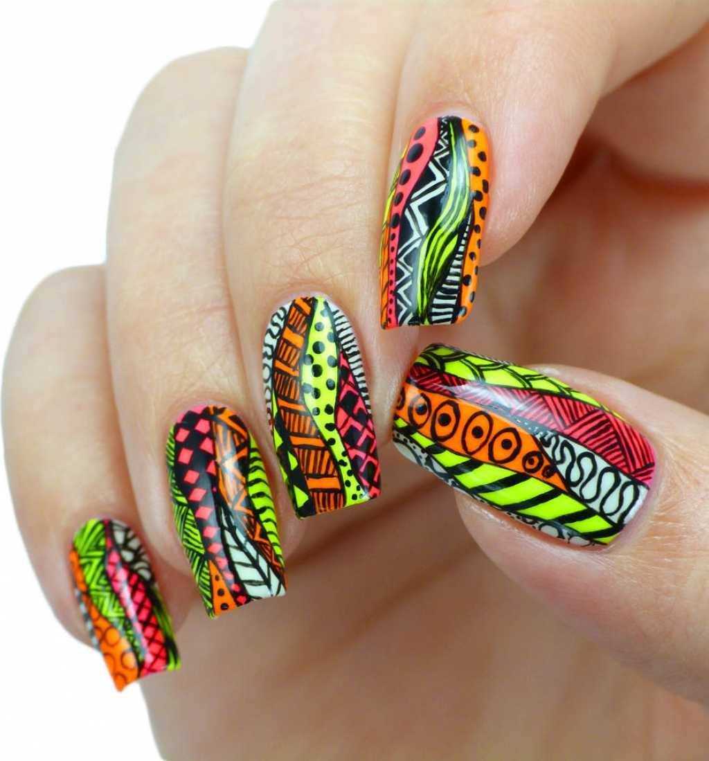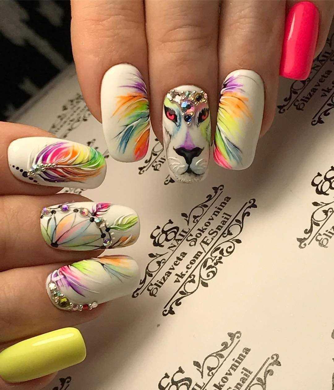 Рисуйте поверх белого мелкие цветные рисунки — это отличный «холст» для воплощения любых художественных идей. Пример фото ногтей «миндаль» ниже.