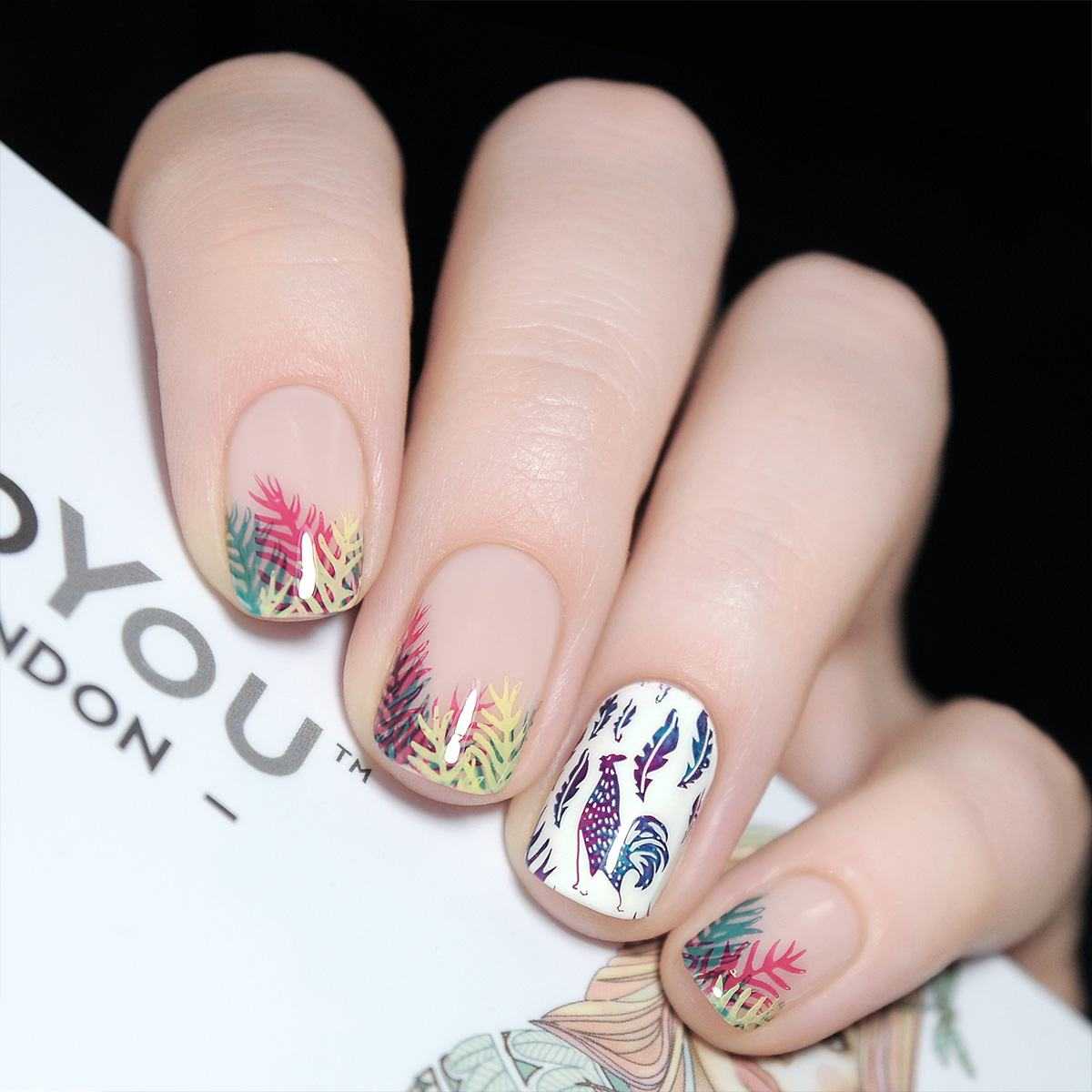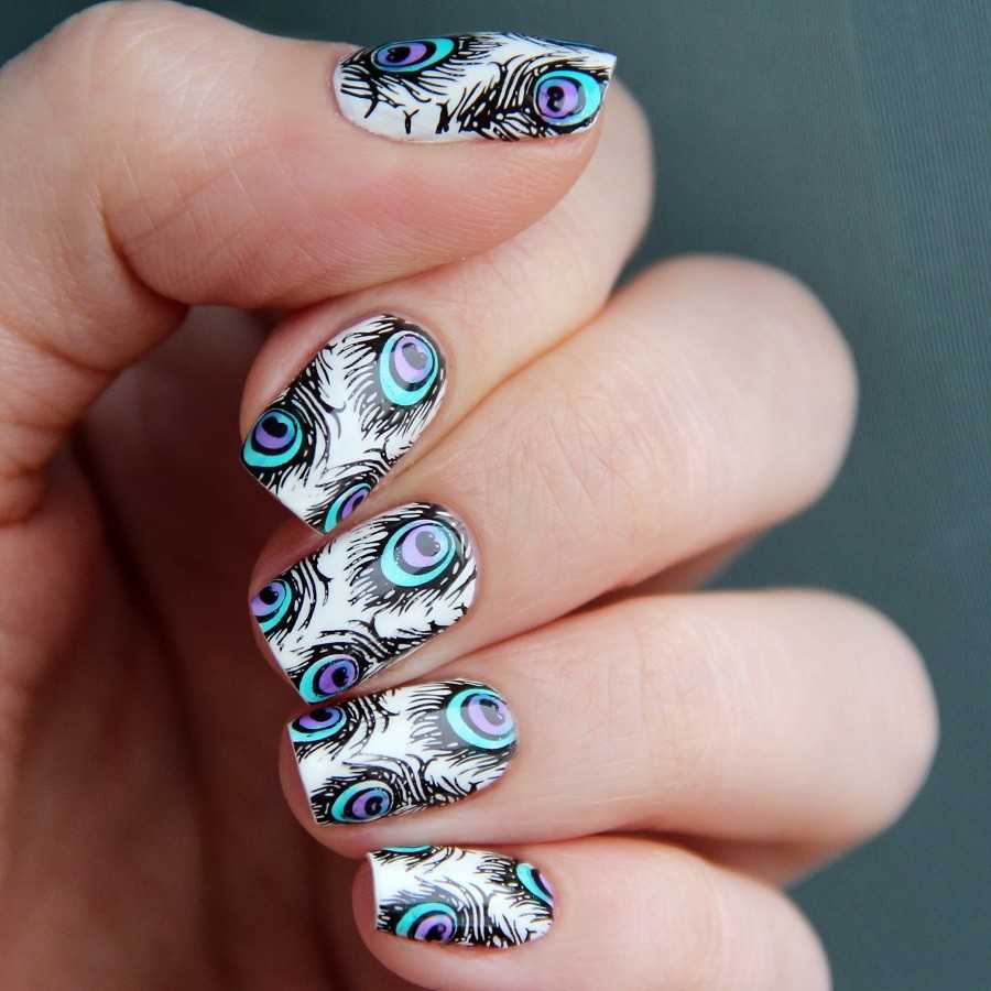 Благодаря легкости выполнения, эта техника стала довольно популярной. Выглядит такой модный маникюр натурально и изыскано. Для его создания используются перья павлина, которые запечатываются на ногтях между слоями прозрачного гель-лака.