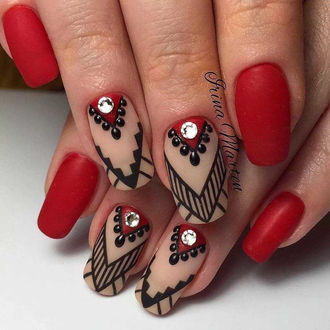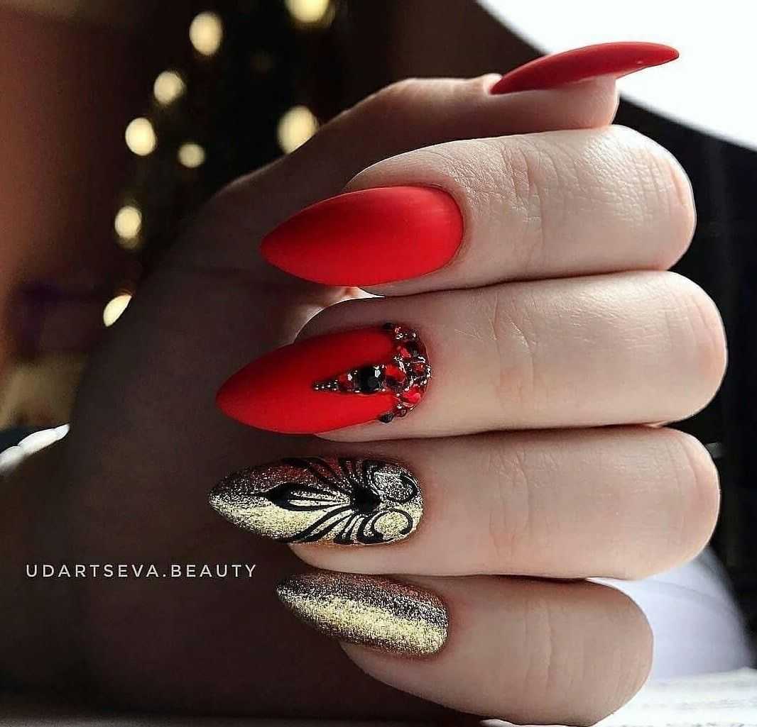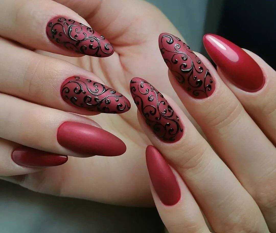 Красный оттенок в маникюре всегда пользовался популярностью. Если хочется разнообразия – можно добавить несколько тонких линий. Обязательное правило – красный миндалевидный маникюр должен сочетаться с вашим образом.
