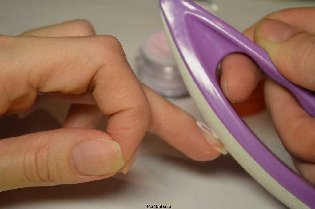 Чтоб не нарушать структуру ногтя, мастера нейл арта должны использовать пилки с мелкой фракцией, подобно полировочному бафу. После чего использовать грунтовку, для подготовки и защиты перед покрытием полимера.