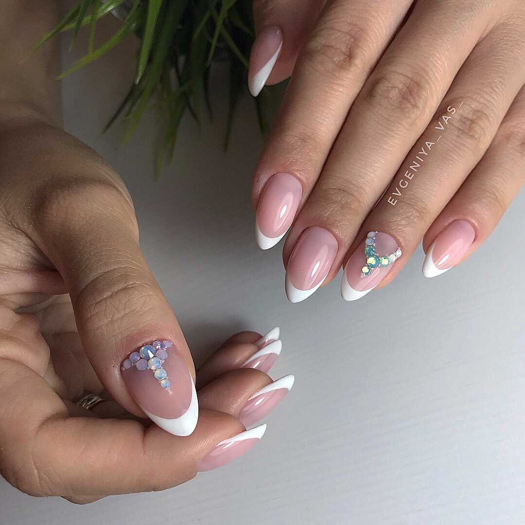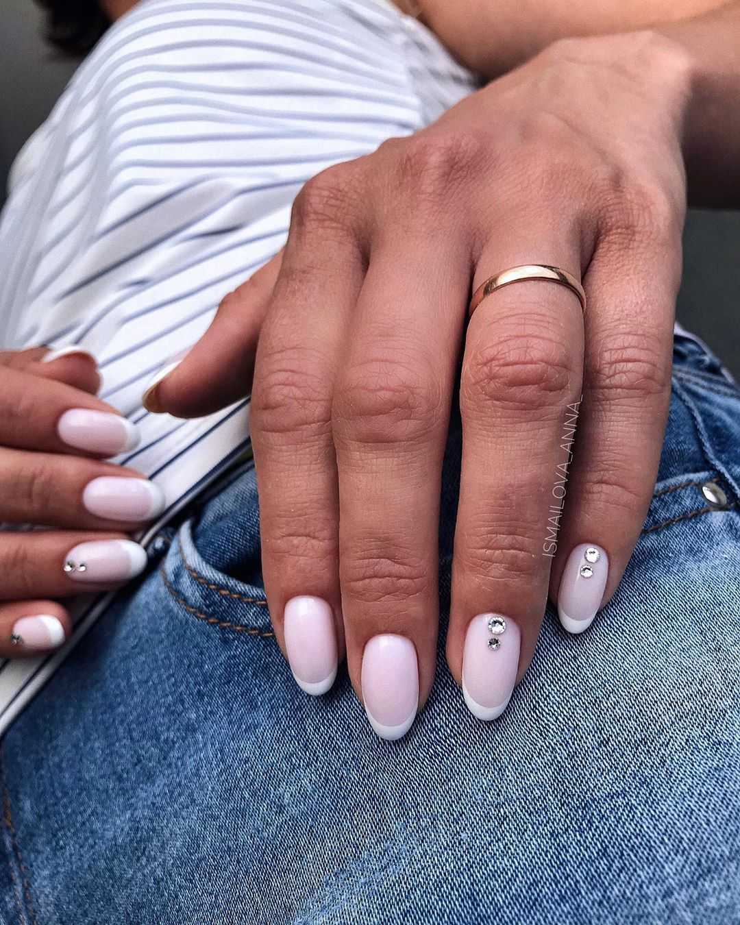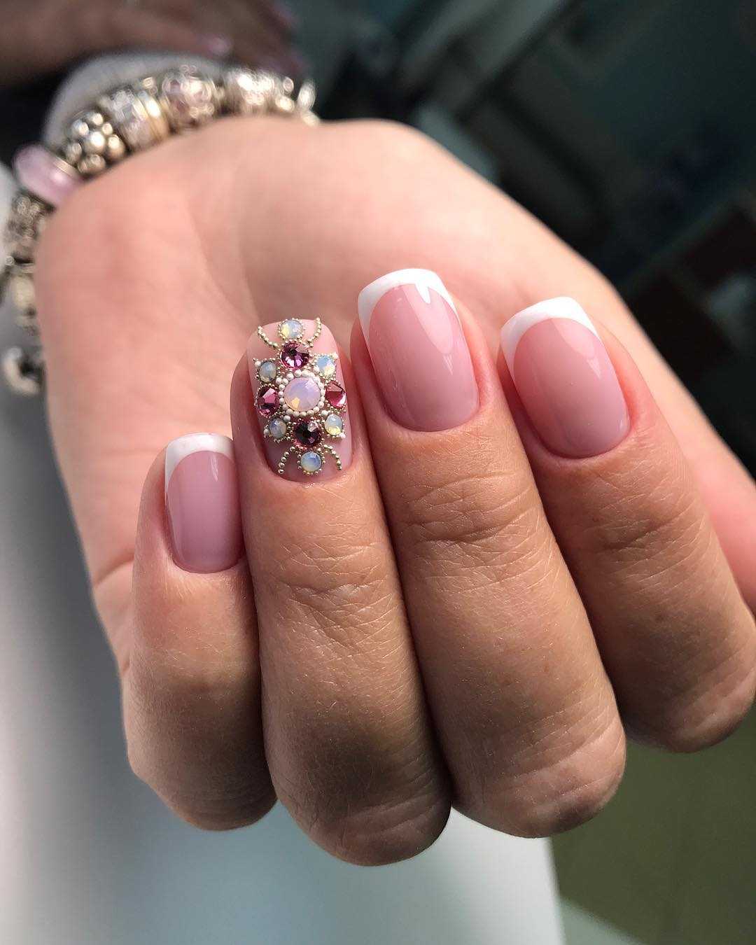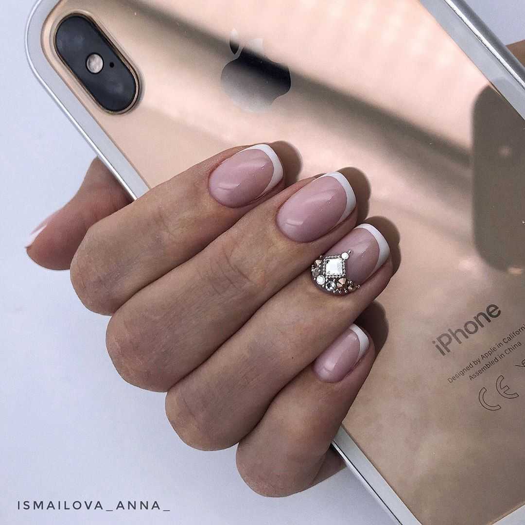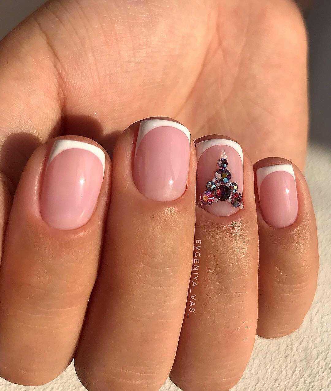 Никогда не теряющий своей актуальности французский маникюр заиграет по-новому, если выполнить линию улыбки не белым лаком, а выложить стразами.