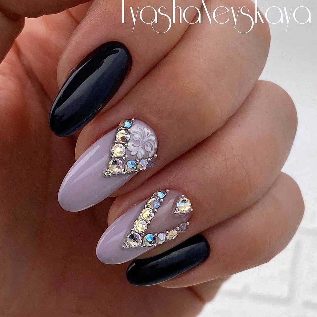Такой вариант оформления может стать ярким украшением ногтевых пластин в повседневном маникюре. Однако нейл-дизайнеры советуют использовать такую вариацию для особых или торжественных случаев, так, как дизайн подразумевает использование объёмных украшений, которые могут быт не особо удобны в повседневной жизни. Суть идеи заключается в гармоничном сочетании объёмных узоров и фигурок лепнины с блестящими стразами. Дополнительно можно украсить декором соседние пальчики. Мера и гармоничное сочетание украшений на ногтевых пластинах в этом случае являются залогом успеха.