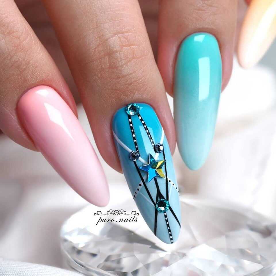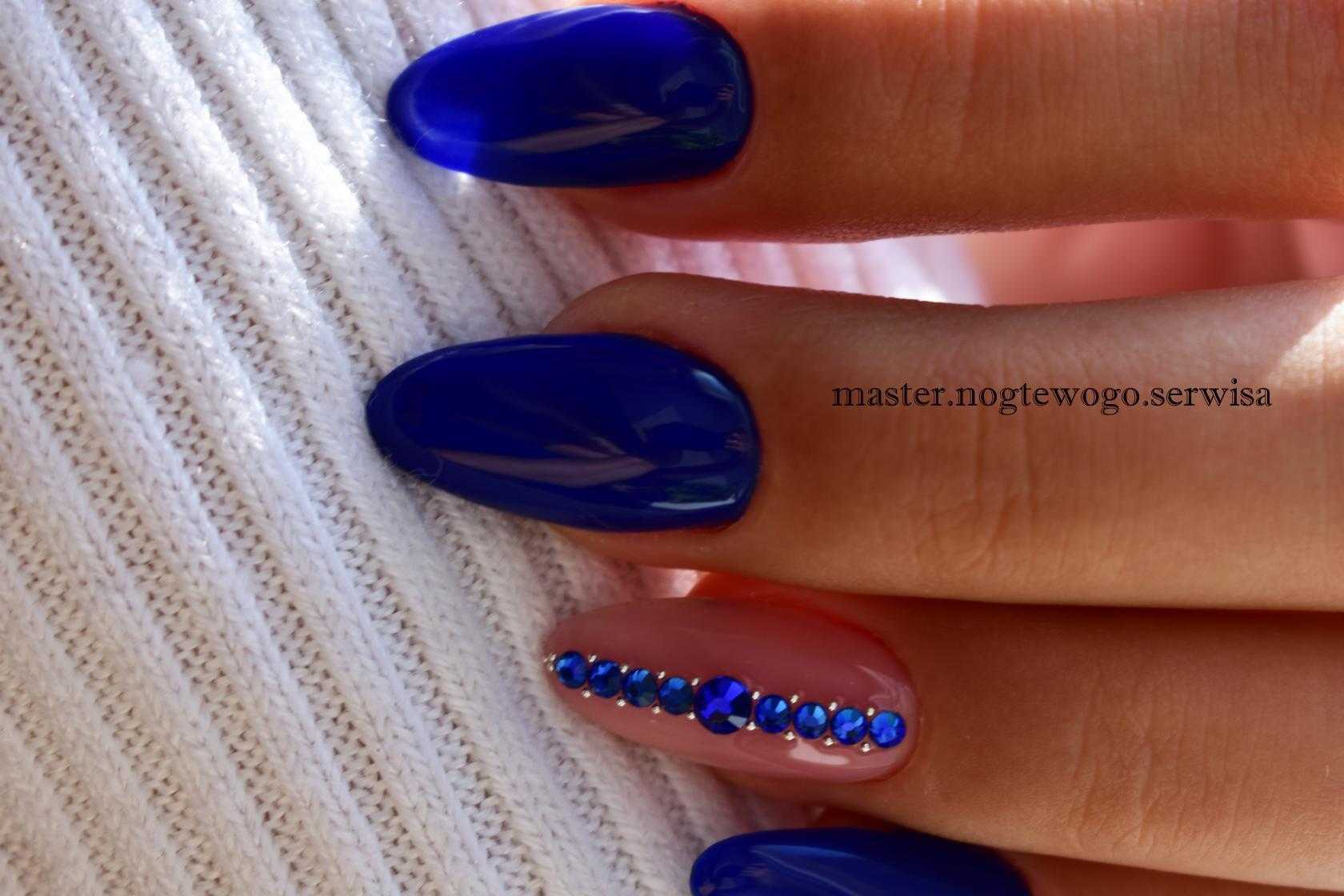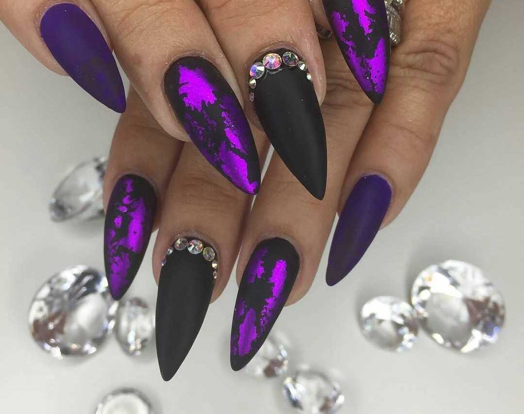 Отличная идея для острого маникюра: яркий базовый лак плюс украшение одного ногтя полностью разными по цвету, форме и размеру стразами. Длинные острые ногти цвета электрик с продольной выкладкой серебристых страз на двух или нескольких ногтях – один из лидеров яркого дизайна ногтей. Можно выбрать дизайн с одним ярким элементом: либо яркое базовое покрытие в сочетании с относительно нейтральными стразами, либо сдержанный цветной оттенок основного лака плюс яркого цвета и неимоверного блеска стразы.
