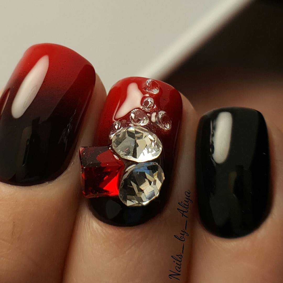 Если вы поклонница именно этого вида украшения, целесообразно к алым оттенкам выбирать бесцветные или стразы с переливом. Название дизайна «Ее величество Роскошь» говорит само за себя и предполагает использование в работе и круглых, и квадратных и треугольных кристалликов.