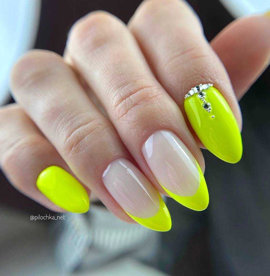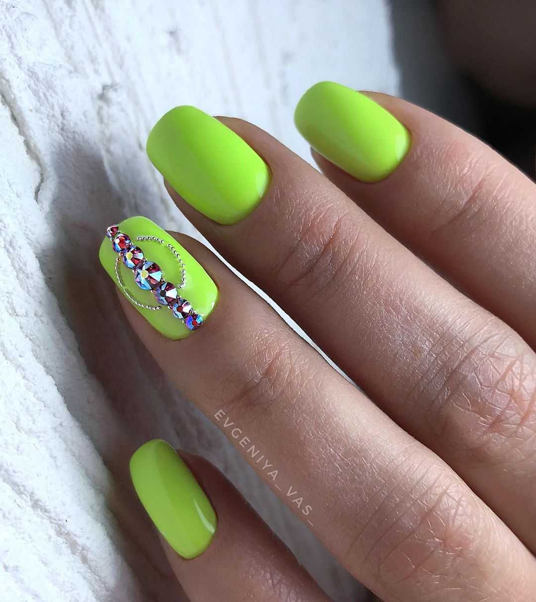 Использование в маникюре насыщенных оттенков совсем не ставит под запрет применение в оформлении блестящей акриловой пудры. Втирка в этом случае не только сглаживает яркость цветов, но и наполняет их лёгким волшебным блеском. Покройте свои ноготки жемчужным или перламутровым материалом. С таким сиянием даже неоновое покрытие будет выглядеть нежно и романтично. Стразы в этом случае гармонично украсят нескольких ногтевых пластин. В большинстве вариаций это россыпь мелких элементов, полоски или разнообразные узоры. Хрустальная крошка, покрывающая полостью один из ноготков, будет смотреться не менее эффектно.