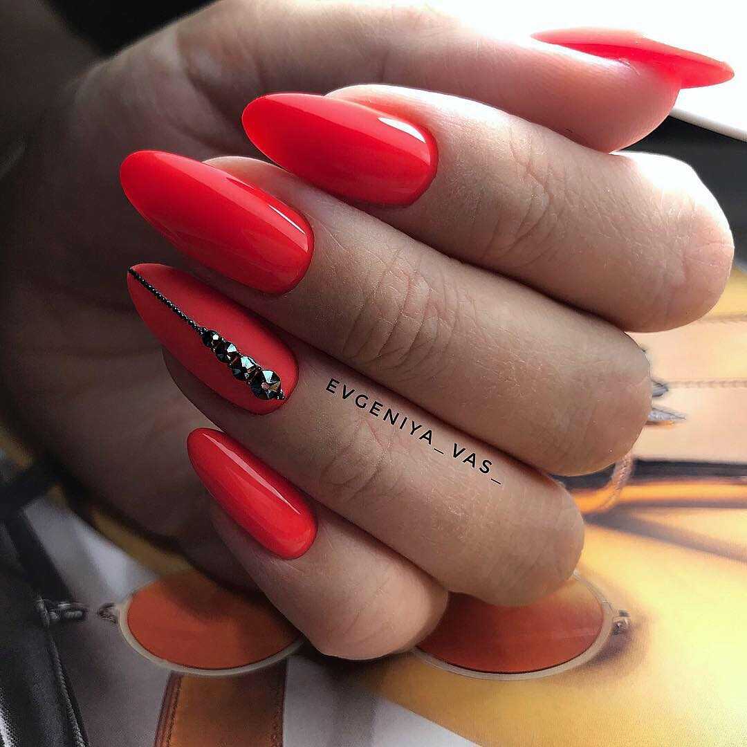 В зависимости от того, какую конфигурацию и величину имеют кристаллики, они могут служить как основой декора, так и прекрасным его дополнением. Для экстравагантного образа роковой женщины или светской дивы отлично подойдет маникюр красного цвета со вставками камешков.