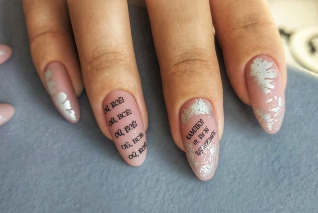 С фольгой возможно создавать сказочные дизайны миндалевидного маникюра, которые всегда отличаются друг от друга. С помощью переводной фольги можно с лёгкостью дополнить любой вид дизайна – надписи на ногтях, рисунки и узоры, френч, блёстки и стразы, градиент и т.д.