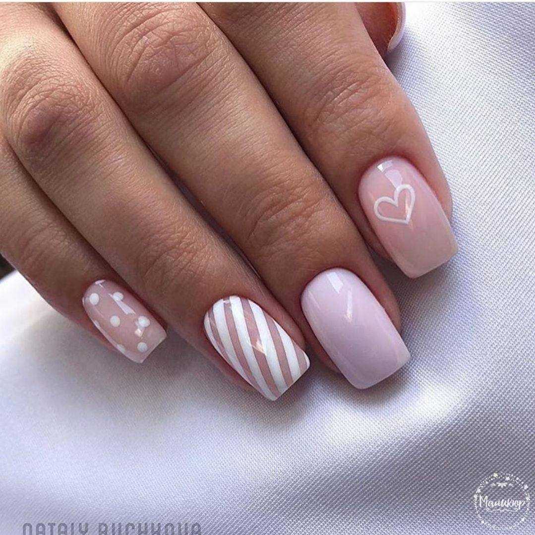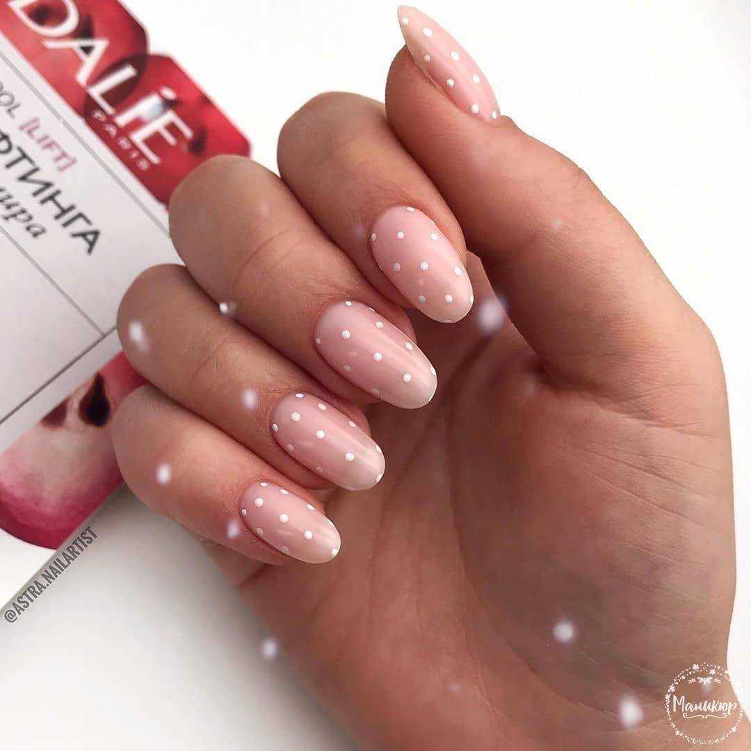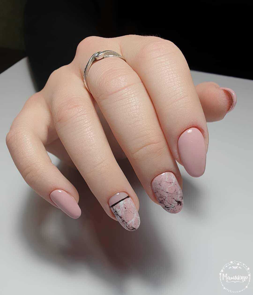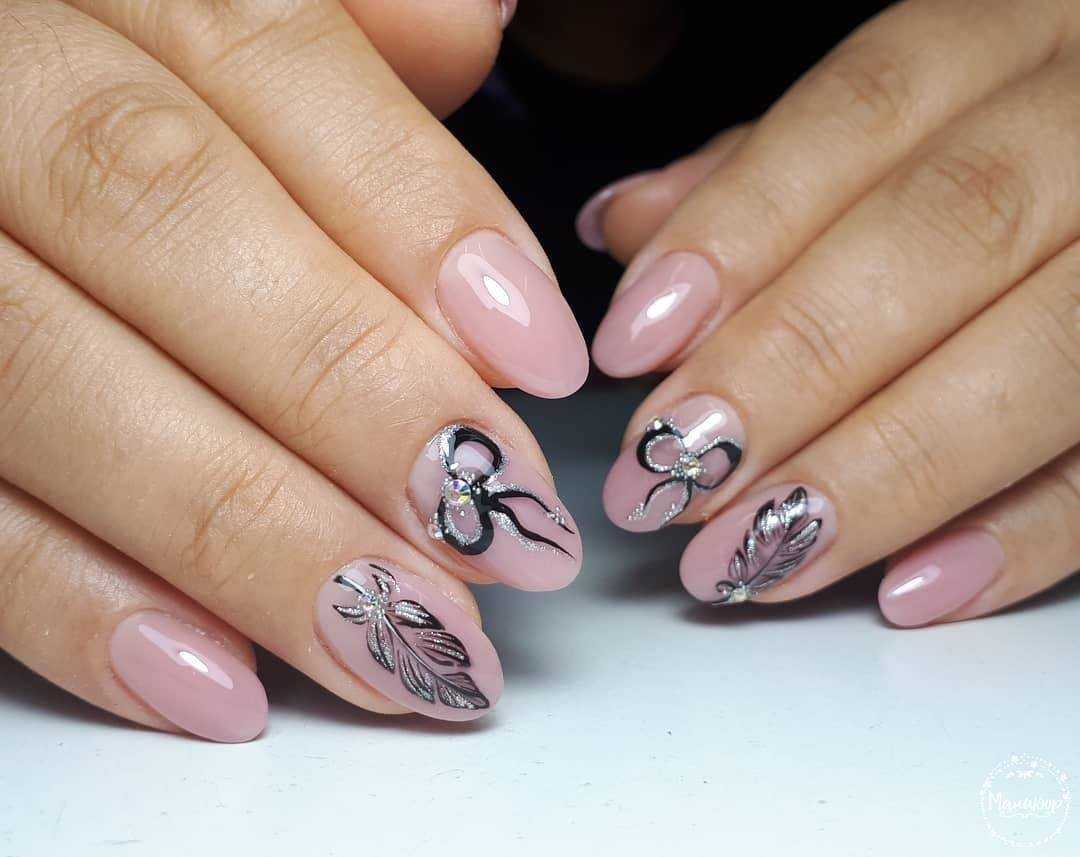Очень красивое и нежное сочетание это розово-бежевый маникюр. Очень часто он украшается стразами, блестками, а также различными рисунками, например, цветами, точками, полосками, кляксами.