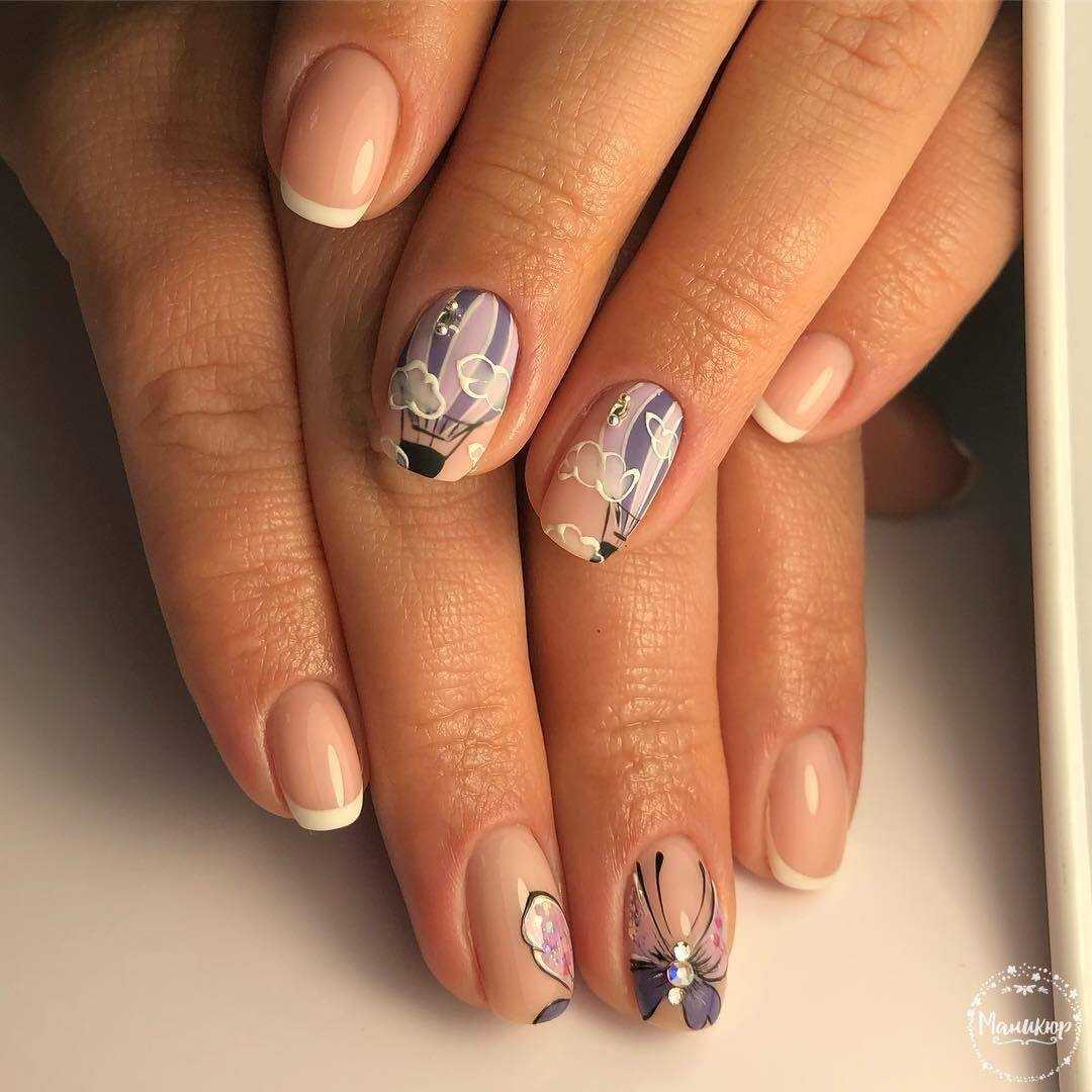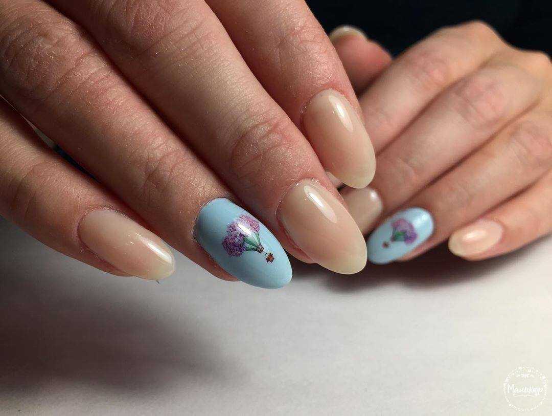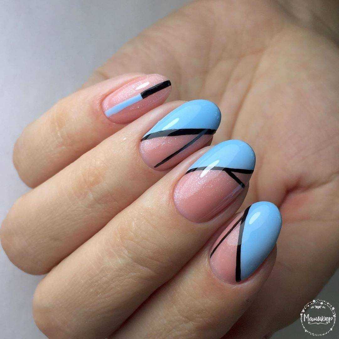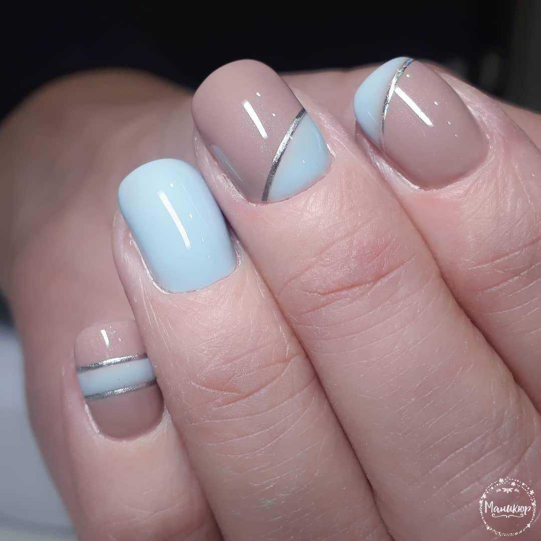 Интересное сочетание голубого лака с телесным бежевым поможет создать творческий и красивый образ. такое сочетание выглядит очень стильно на ногтях любой длины.