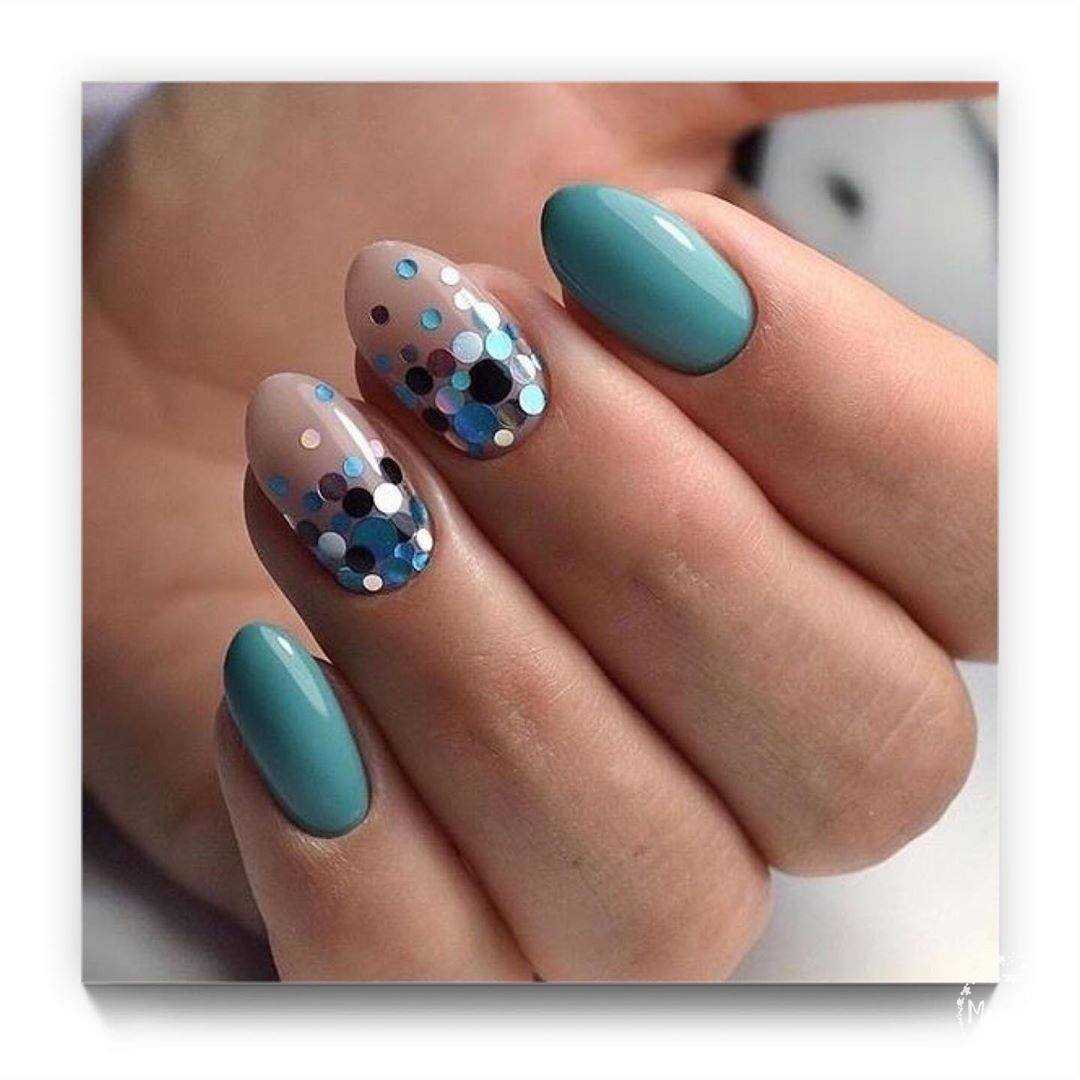 Бежево-мятный маникюр на ногтях выглядит очень мило и нежно. В первом случае ногтевая пластина разделена телесным и мятным цветом и серебристой полоской. Во втором случае ногти украшены горошком, зигзагами и блестками.