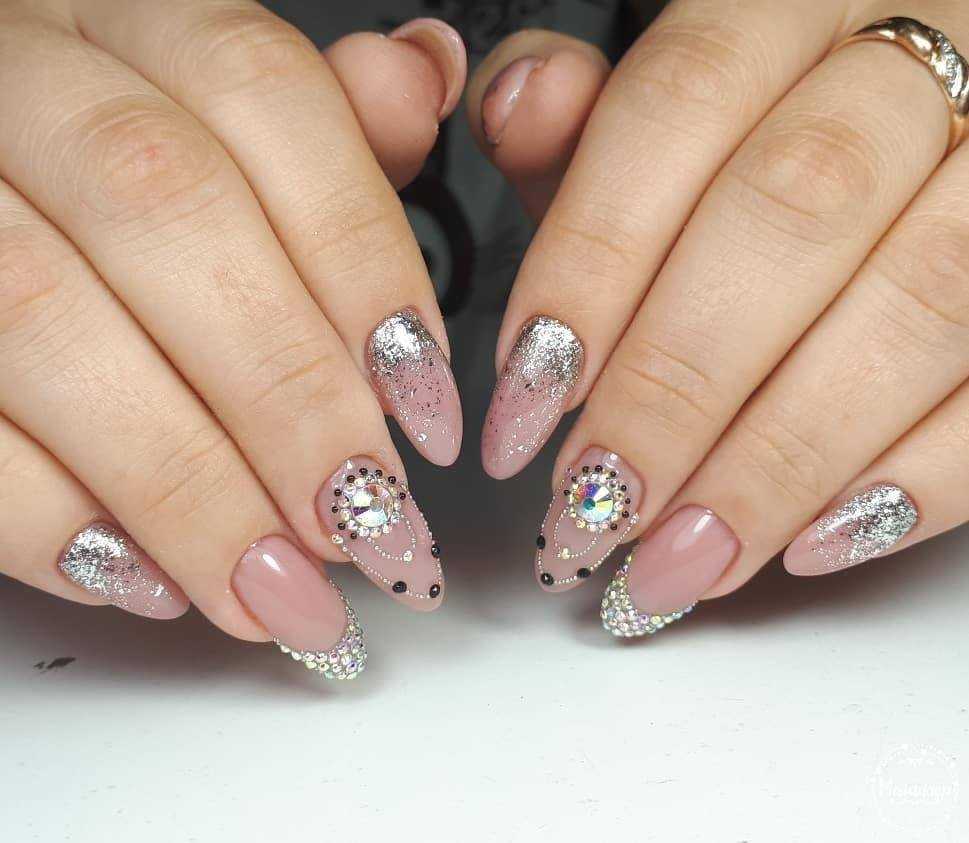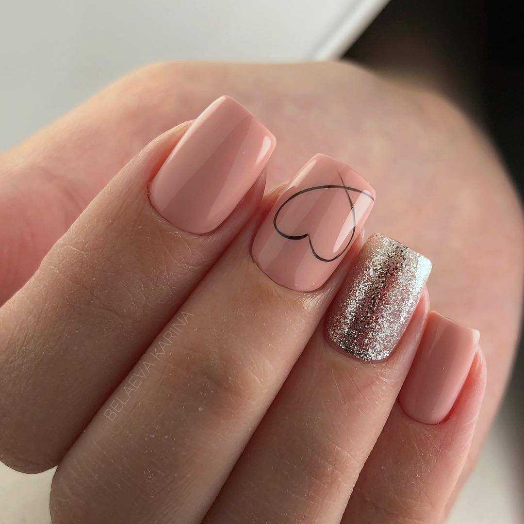 Единственным исключением являются мелкие серебристые блески. Ими можно дополнить сдержанный бежевый маникюр. Серебристыми блесками можно покрыть сразу несколько ногтей на руке, чередуя их с матовым или глянцевым телесным лаком.