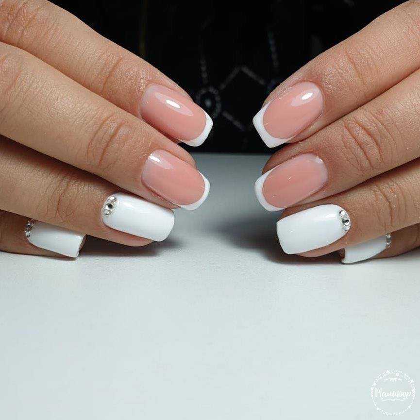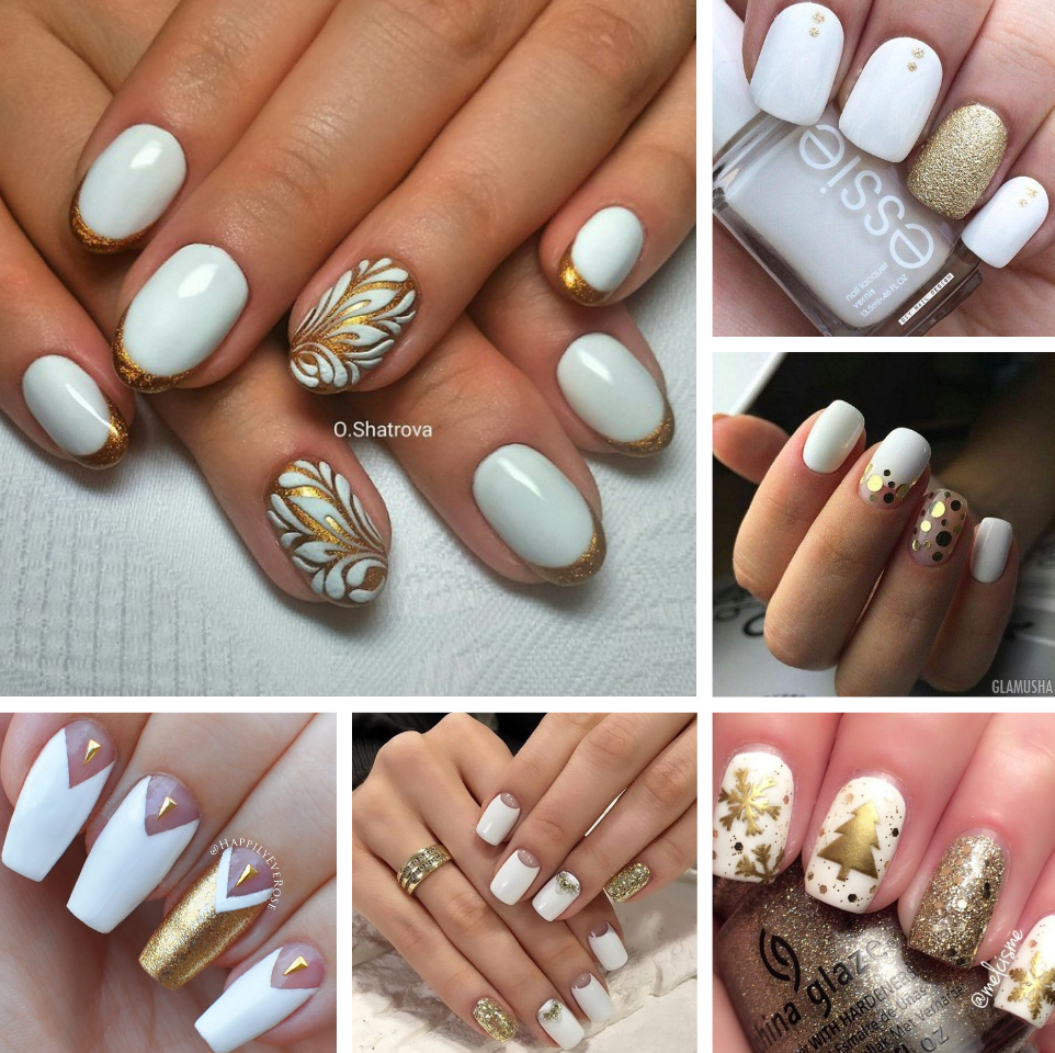 Белый лак идеально сочетается с бежевым и золотым. Это может быть классический френч с двойным выделением края пластины — золотым и белым. Не менее эффектно будет смотреться и лунный декор. Кроме того, для создания интересного дизайна можно чередовать белое и бежевое покрытие, а для декора оставить золотой.