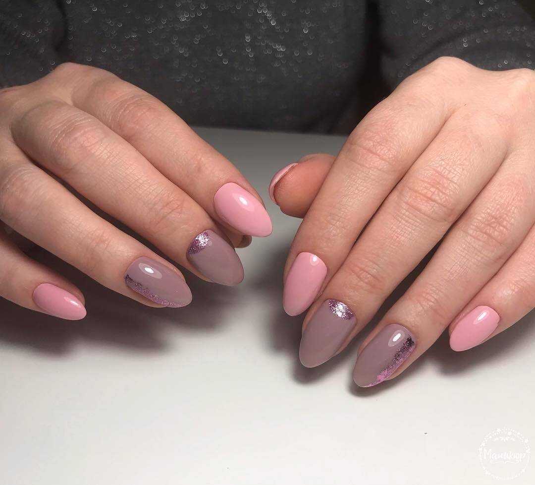 Дизайн с применением розового и бежевого оттенка подходит нежным романтическим натурам. Такой маникюр подходит как для работы в офисе, так и для свадьбы или другого торжественного мероприятия. Существует 2 варианта комбинирования оттенков: