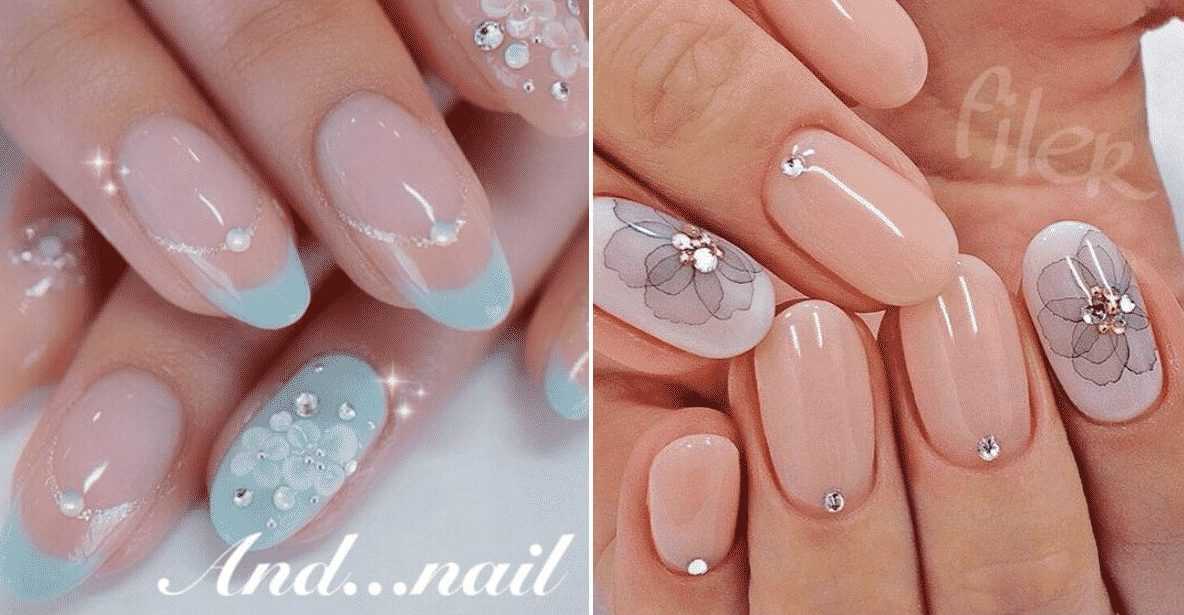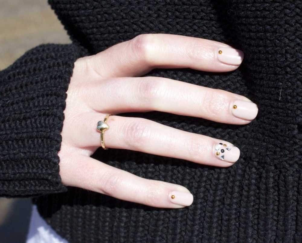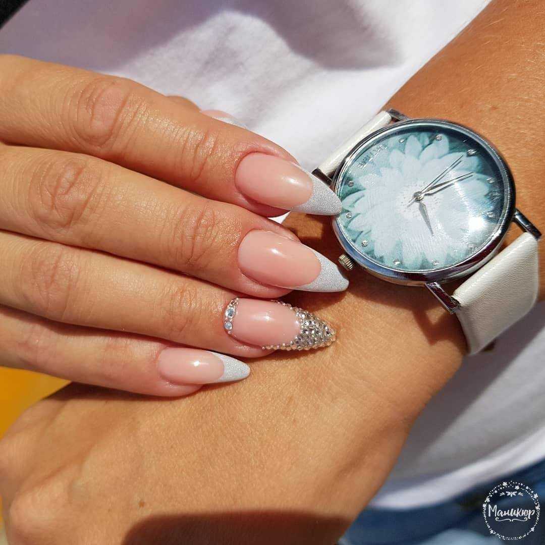 Использовать стразы рекомендуется в довольно редких случаях, так как они очень сильно мешают. Вы можете их приклеить на определенное мероприятие, но длительное время носить их будет очень сложно. Чаще всего такую технику используют при нанесение бежевого маникюра на длинные ногти, так как созданы максимально удобные условия