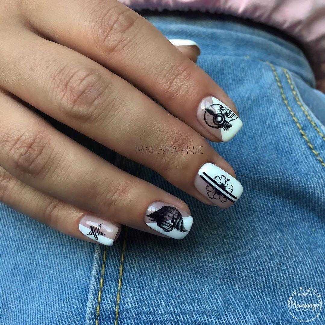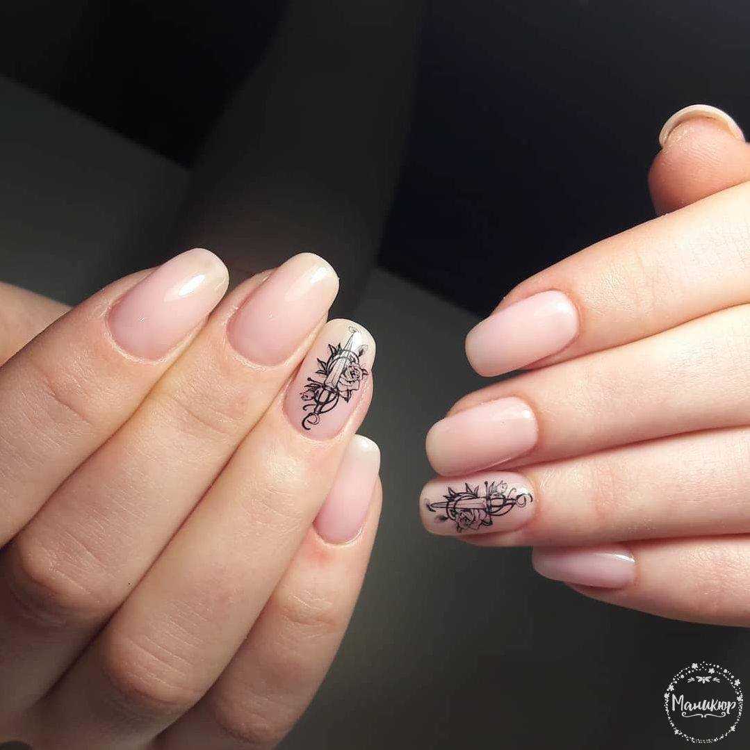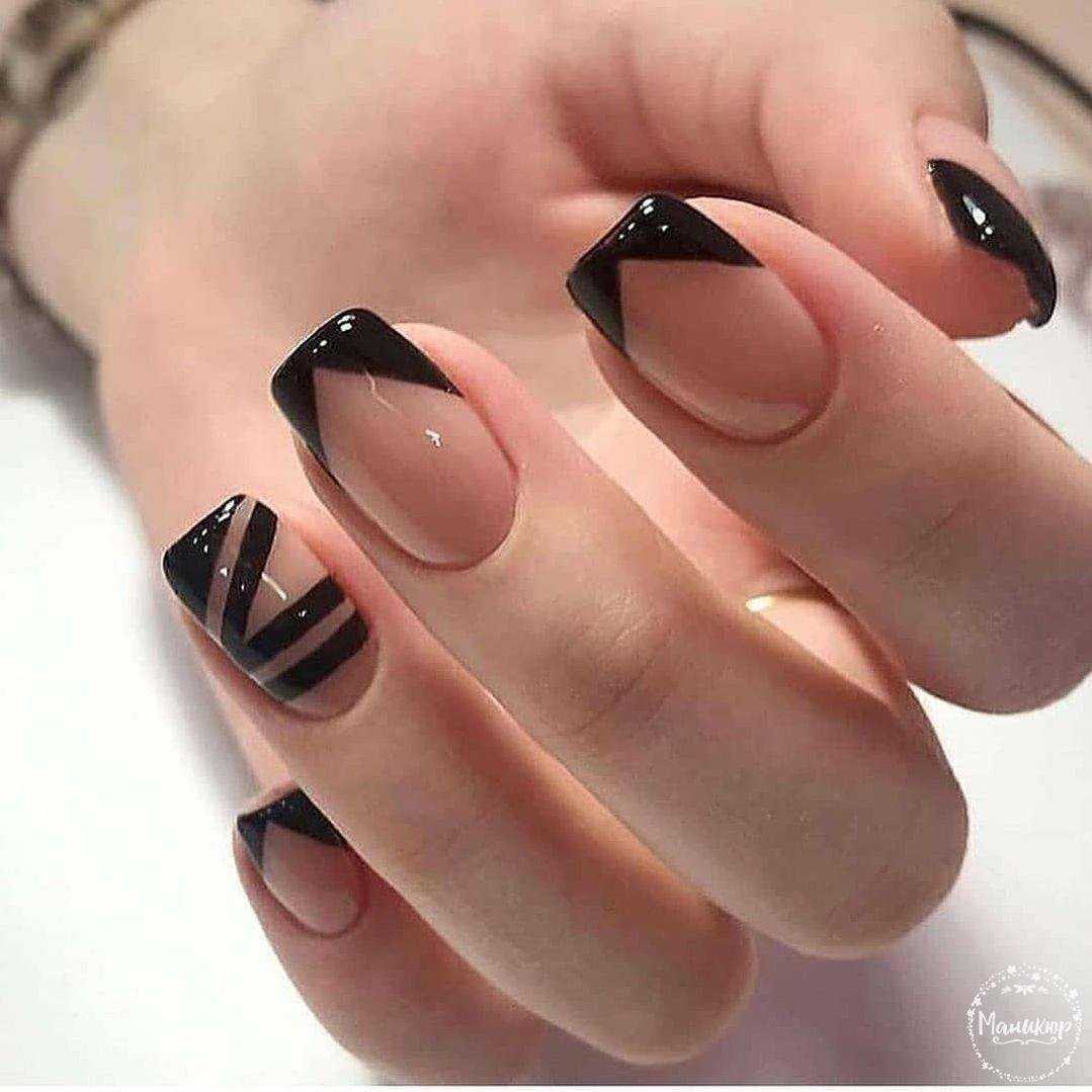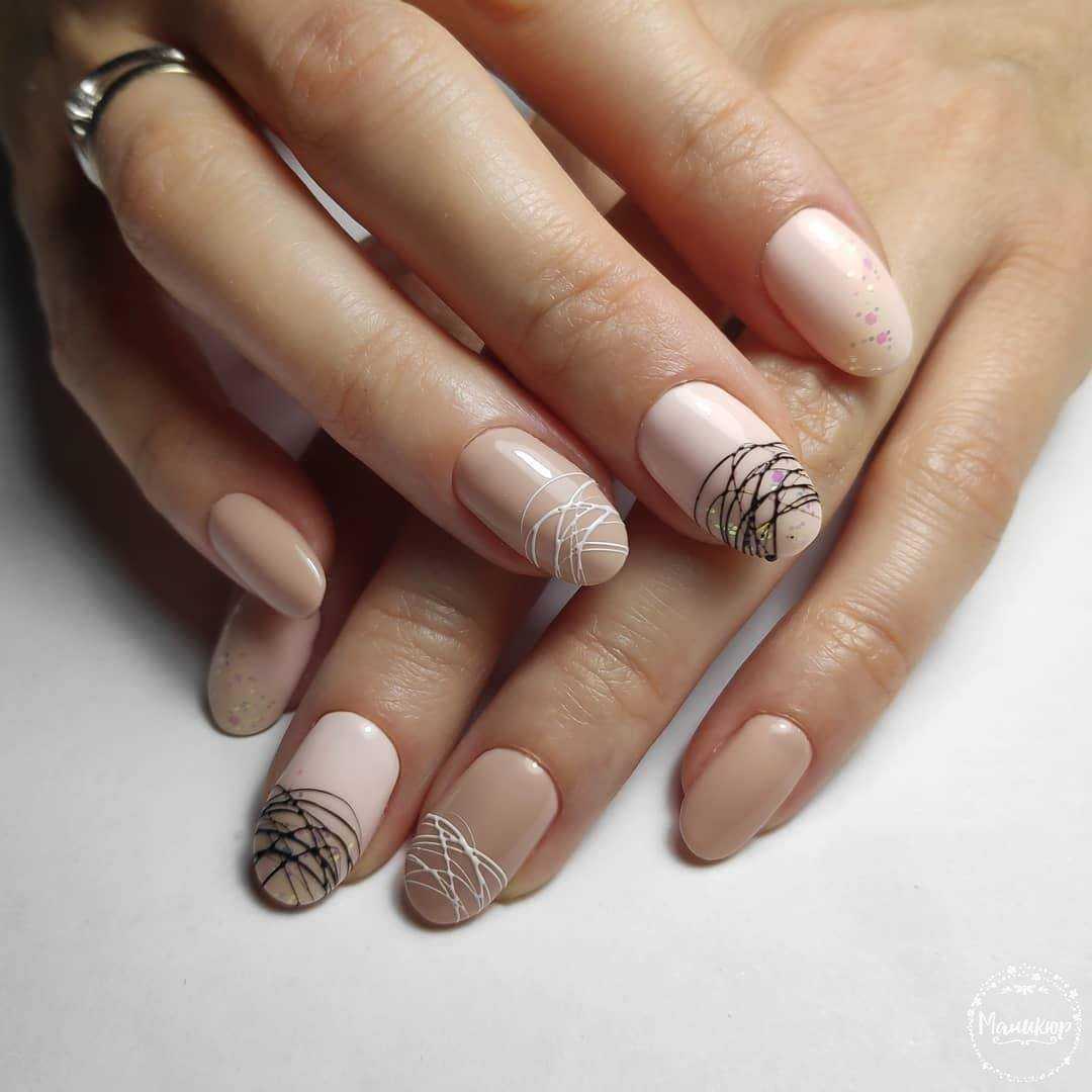 Черная вуаль или рисунок на нюдовом фоне — классика, которую можно дополнить золотыми штрихами. Не стоит перебарщивать с черной гаммой, такой маникюр может выглядеть слишком “тяжелым” и мрачным.