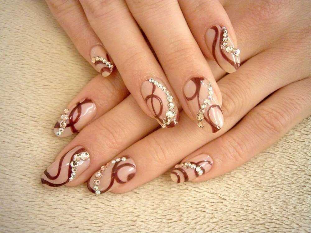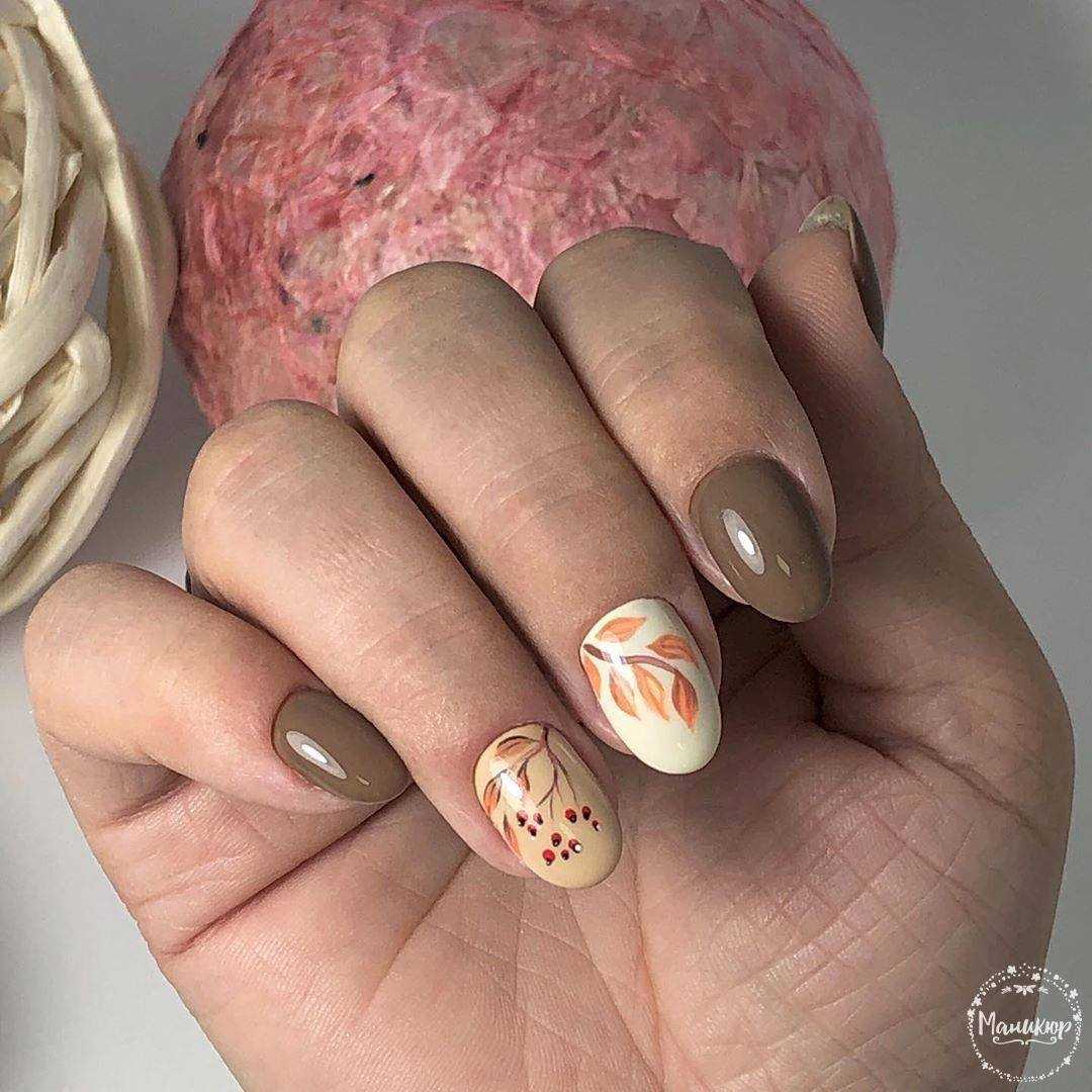 Шоколадные оттенки, золото и нюд — отличное сочетание. Самый простой декор — чередование оттенков лака на каждом пальчике с золотым дизайном — геометрическим рисунком, втиркой, стразами и др.