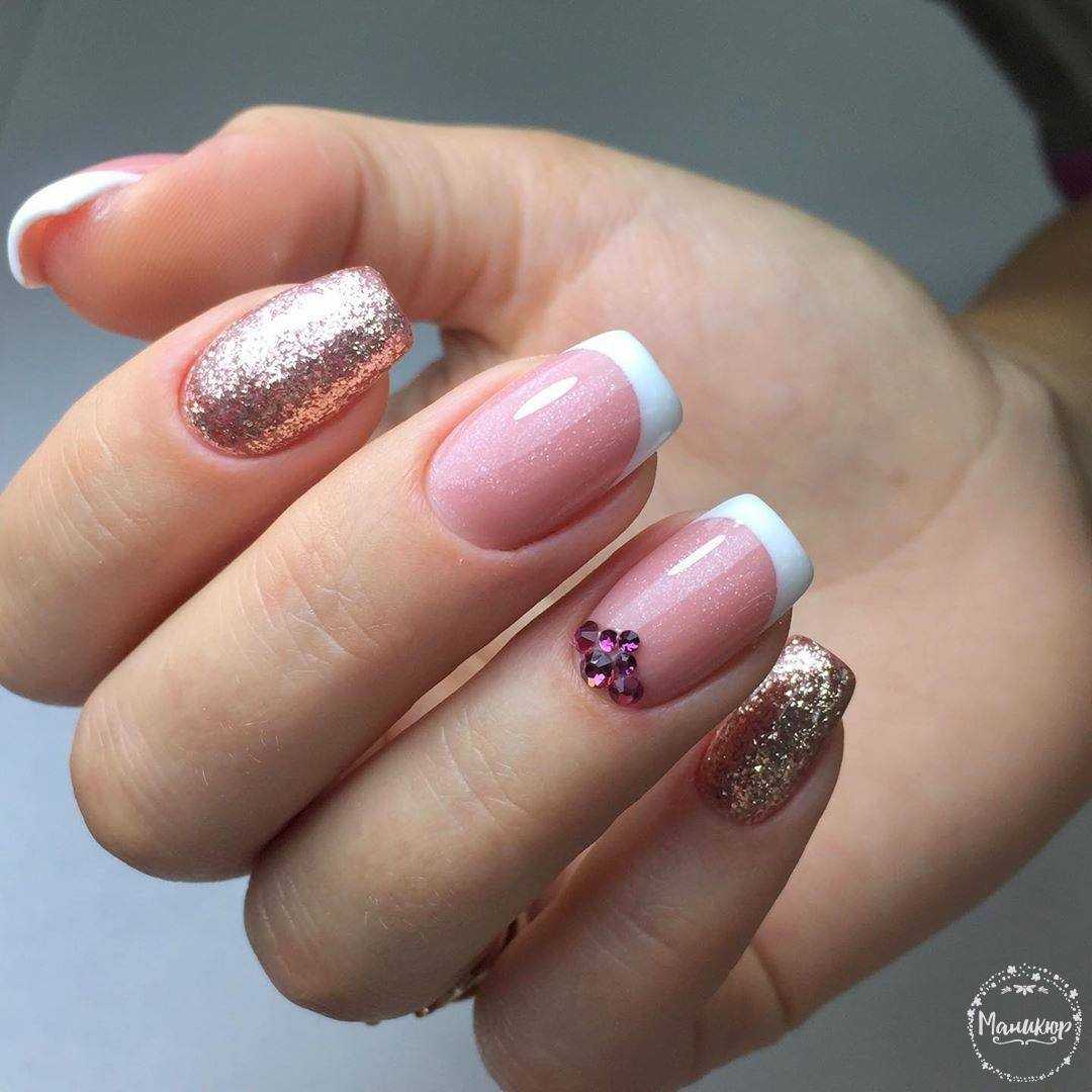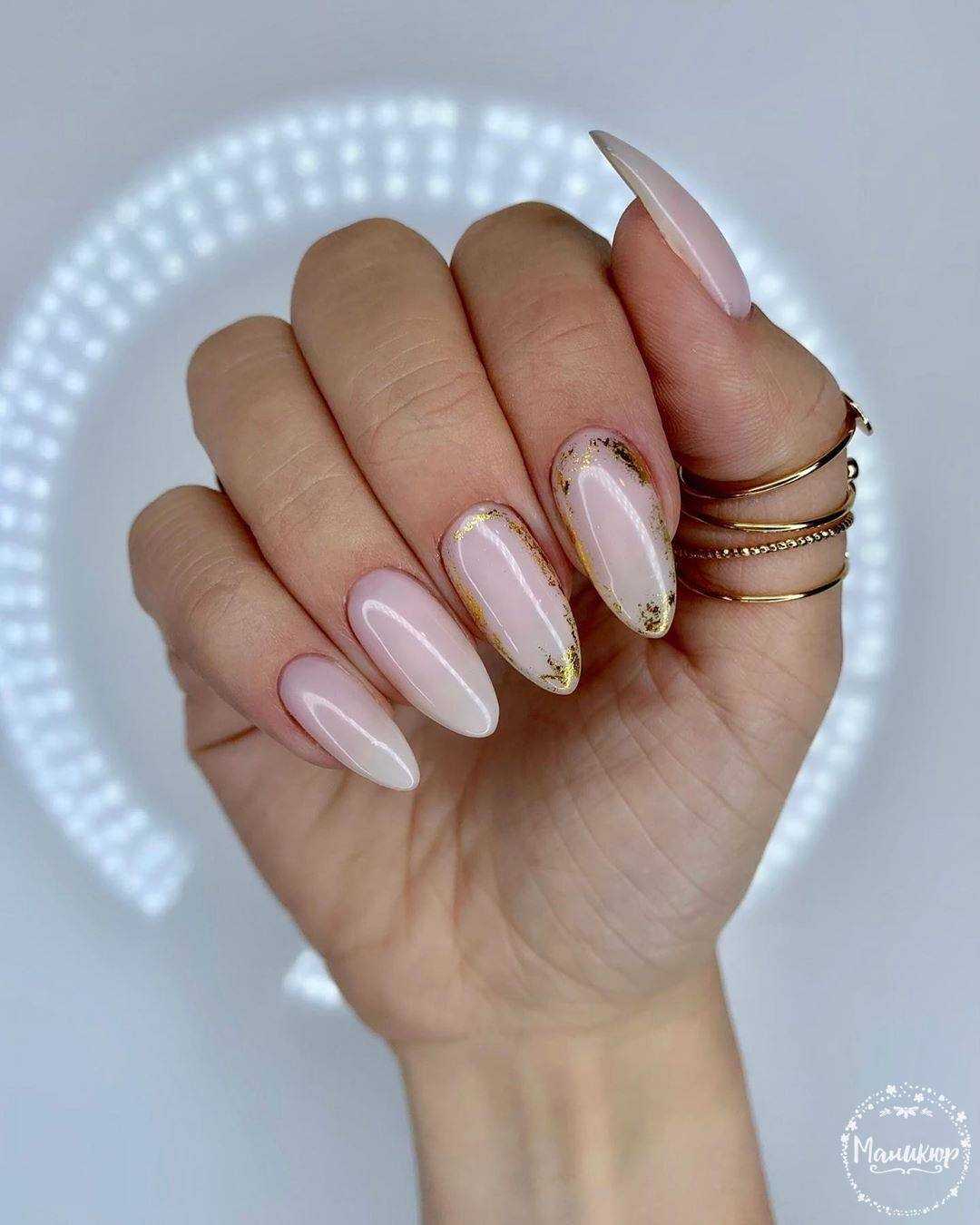 Нюдовые дизайны маникюра всегда в моде. Палитра розового и бежевого многообразны и не ограничены всего одной-двумя позициями. При сочетании цветов стоит руководствоваться правилом: оба цвета должны быть из одной палитры — теплой или холодной. А золотой декор только еще больше подружит эту пару.