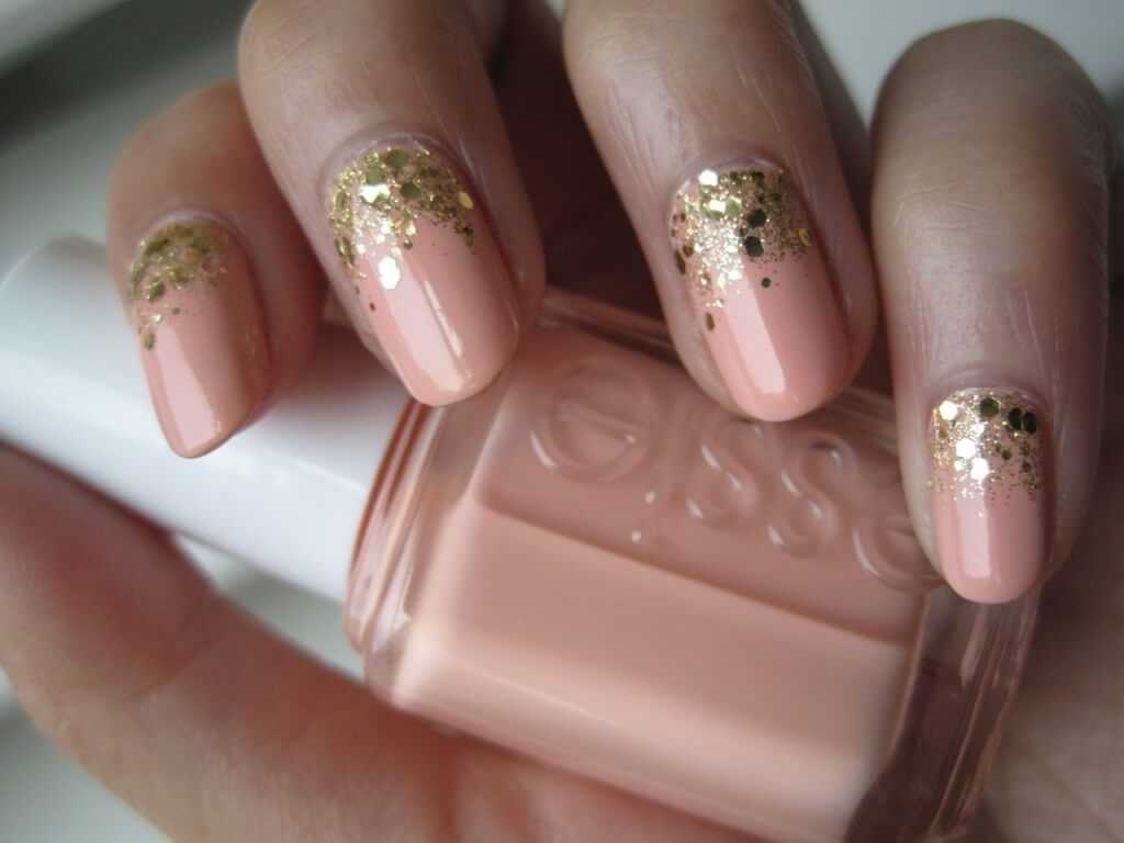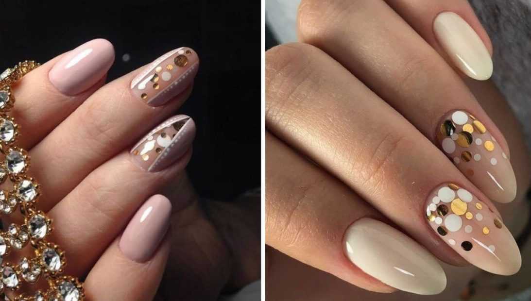 Еще одним модным вариантом блесток являются блестящие конфетти. По-другому их называют камифубуки. Их принято располагать у основания или в середине ногтевой пластины. На бежевом фоне можно использовать сразу несколько оттенков конфетти. При помощи этих декоративных элементов можно создать модный эффект градиента.
