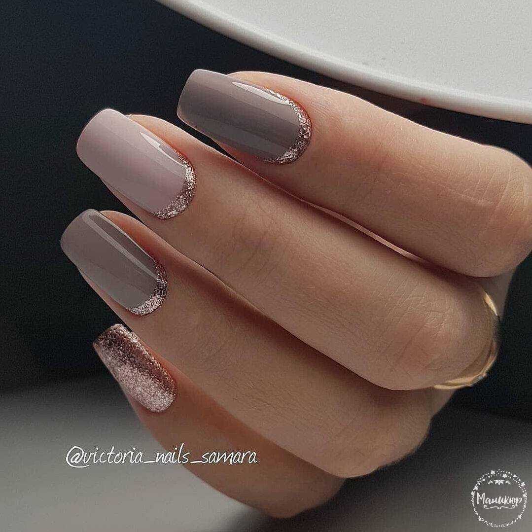 Для удачного дополнения бежевого с золотым маникюра стоит выбирать теплые серые: с желтоватым, коричневым, розоватым подтоном. Думаете, что получится слишком скучный маникюр? Просто нанесите больше золота.