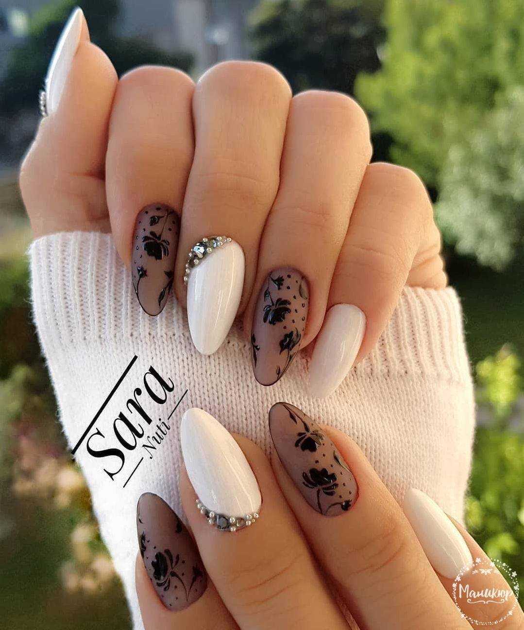 Разнообразие ярких, или наоборот, нежных цветочных мотивов только подчеркнуть изысканность вашего маникюра и привлекут внимание. Очень оригинальными стали ажурные кружева чёрного или белого цветов