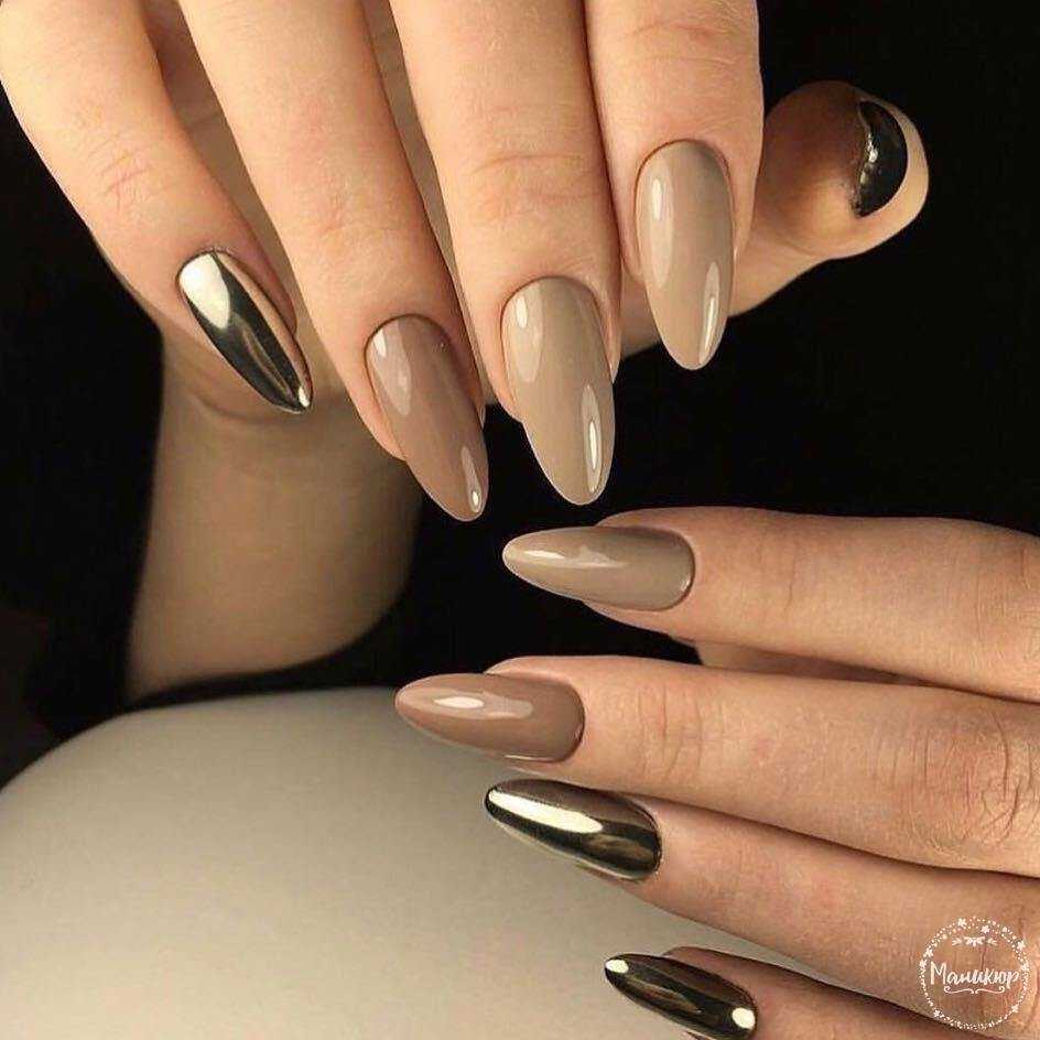 - окрашивание ногтей на одной руке в бежевый, на другой в коричневый цвет. Золотой используем для дизайна — выделения одного ноготка, геометрических рисунков на обеих руках, френча или лунного;