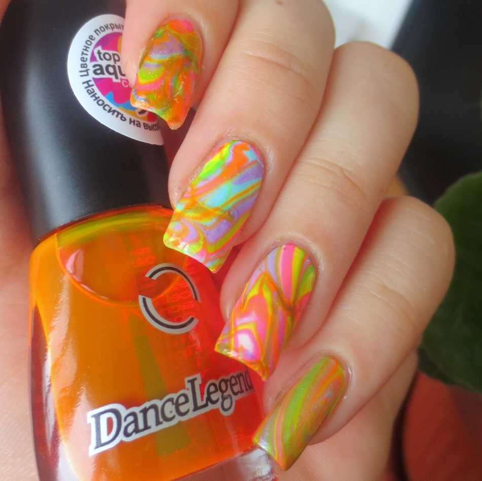 Радужный летний водный дизайн создается с помощью ярких неоновых оттенков. Сочный розовый, фиолетовый, зеленый, голубой и желтый смешиваются в оригинальные узоры.