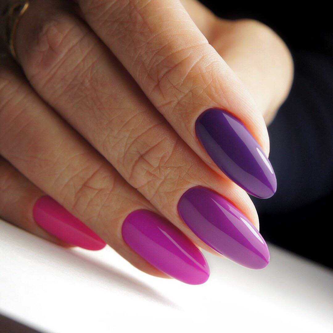 Если вы хотите, чтобы однотонный маникюр смотрелся интереснее, то используйте несколько оттенков фиолетового. Достаточно выбрать два схожих полутона фиолетового, чтобы однотонный маникюр выглядел динамичнее и эффектнее. Нейл-мастера рекомендуют использовать для однотонного покрытия глянцевые гель-лаки. На матовой поверхности фиолетовый цвет будет выглядеть тускло, нуждаться в блестящем декоре стразами, бульонками, глиттером.