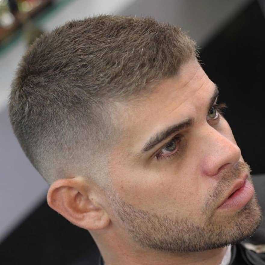 Военную прическу от классического полубокса отличает короткая, но заметная длина волос на макушке.