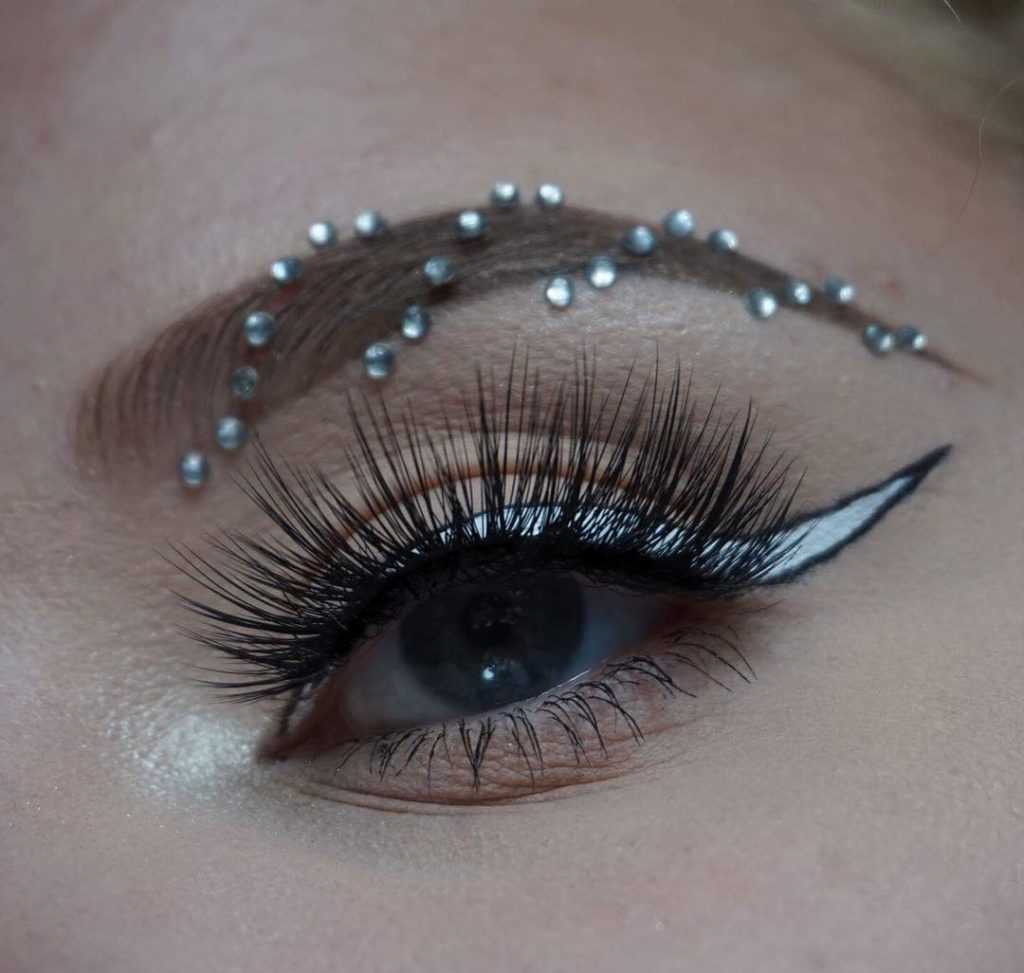 - Со стразами. Этот праздничный и очень необычный тренд появился совсем недавно. К стразам крепятся пучки гипоаллергенных искусственных волосков, которые клеятся на надбровные дуги.
