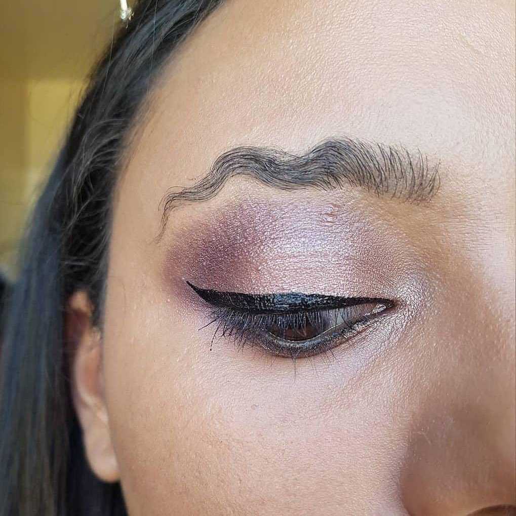 Ультрасовременная форма с претензией к оригинальности. Сделать надбровные дуги волнистыми решится далеко не каждая девушка. Выглядит это дерзко и броско. Одна из первооткрывательниц такого смелого макияжа — известная блогер Promise Tamang. Девушка подробно рассказала, как сделать волнистые брови. Сначала она заклеила клеем для ресниц то, чем наградила её природа. Затем закрасила волоски консилером и тональным кремом и нарисовала маркером волнистую линию.