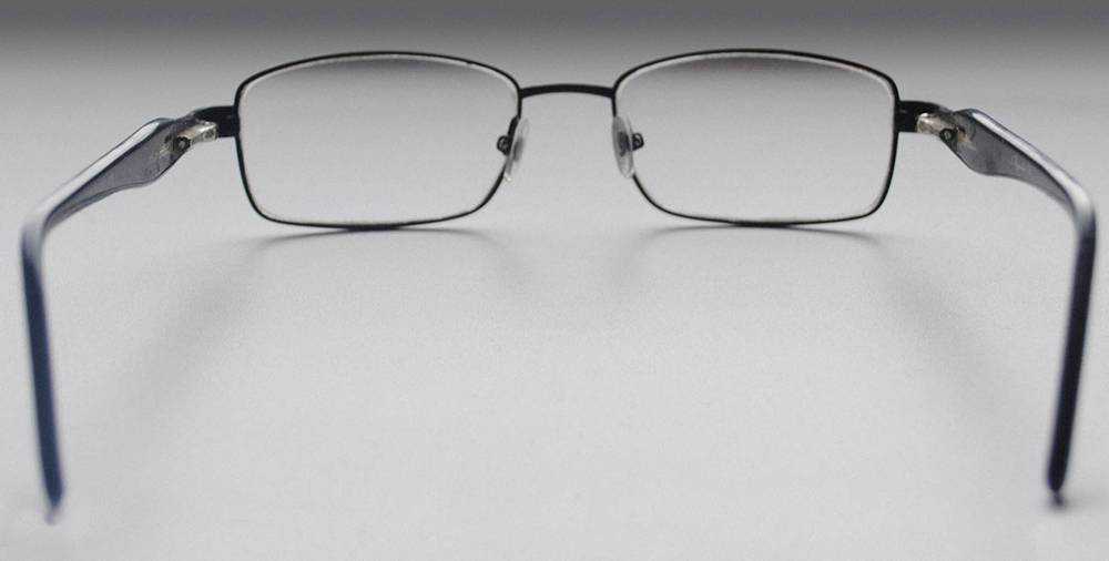 У меня симметричное лицо, поэтому оправа тоже должна быть симметричной. Чтобы это проверить, я кладу очки на ровную поверхность и смотрю на заушники — они должны быть на одной плоскости.