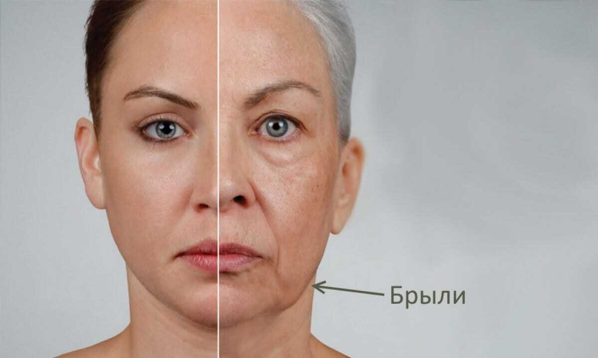 Провисание кожи в районе нижней челюсти называют брылями. Это возрастное изменение, характерное для женщин старше 35-40 лет. Из-за провисшей кожи теряется четкость лицевого овала.