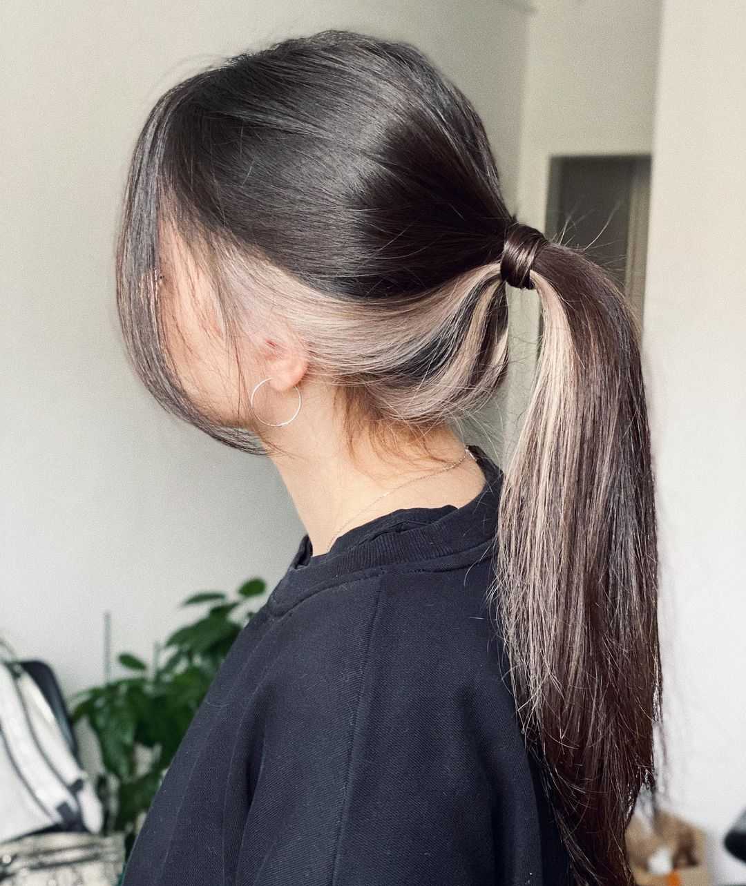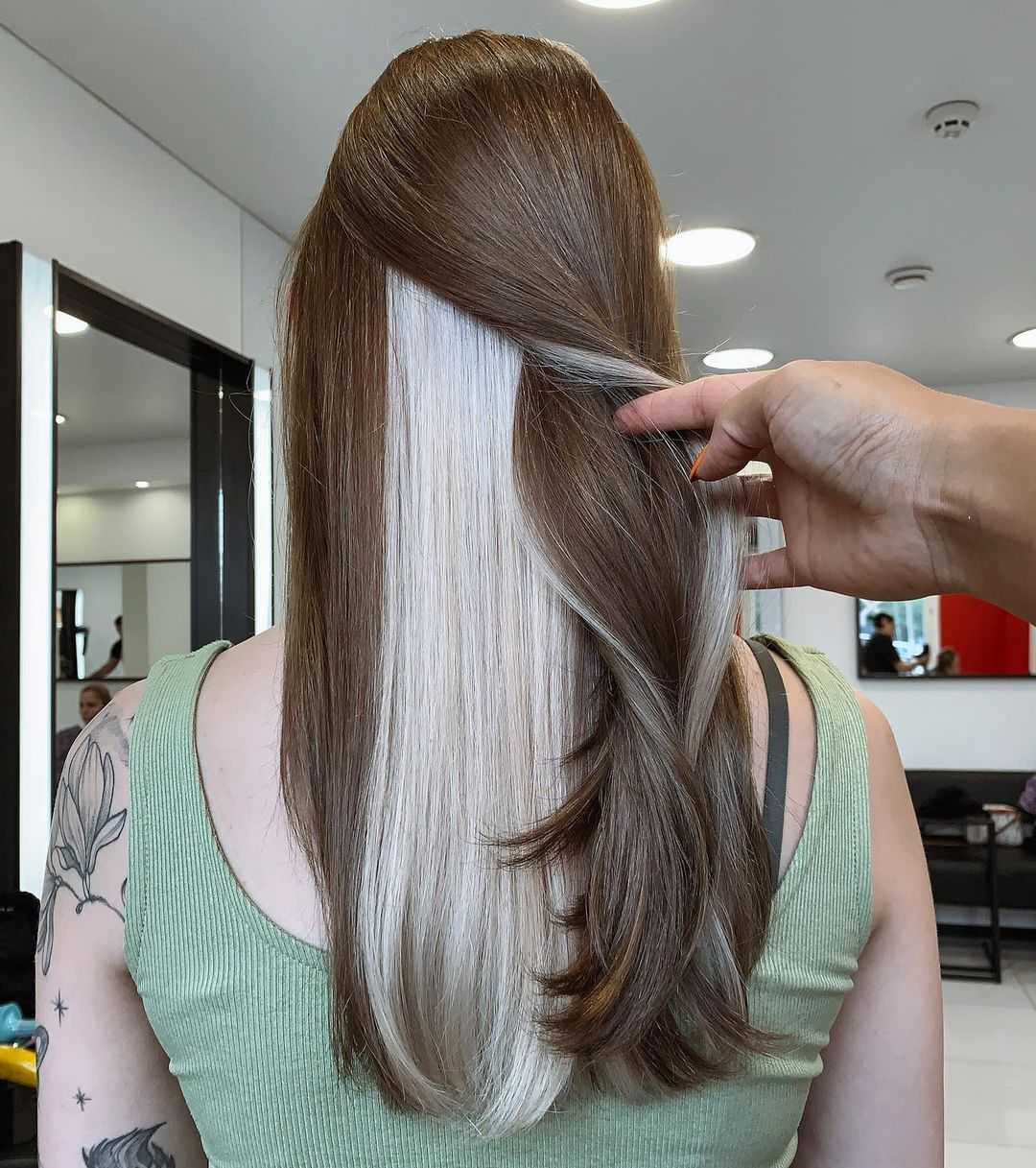 Больше вариантов открывается для тех, кто носит волосы до плеч или ниже. В этом случае уже можно красить целые пряди от корней до кончиков. Вы можете раскрыть свой секрет, собрав волосы в низкий хвост или пучок.