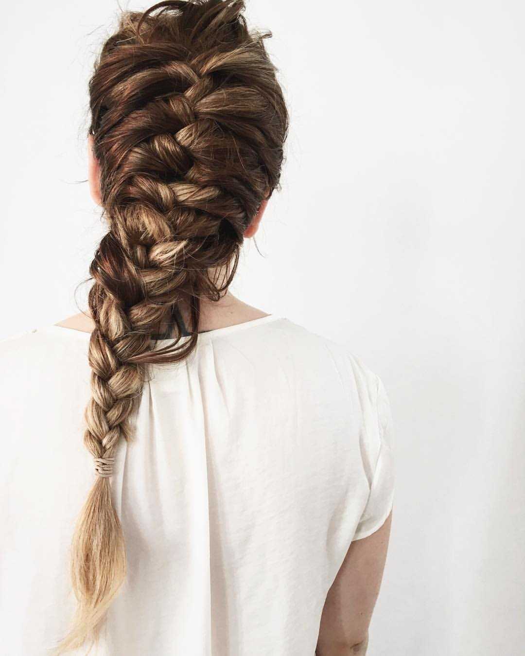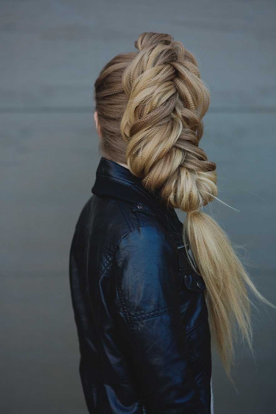 - Рыбий хвост. Несмотря на название, прическа, выполненная в данной технике, выглядит актуально и стильно. При этом не требует особых навыков. Волосы просто делят на две части и перекрещивают тонкие прядки между собой.