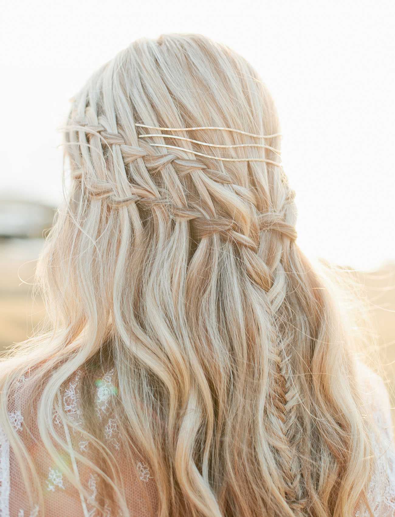 - Водопад. Своеобразная разновидность французской косы. Отличие прически – некоторые пряди не затягивают, а оставляют свободно ниспадать. За счет сочетания с распущенными волосами выглядит романтично и нежно.