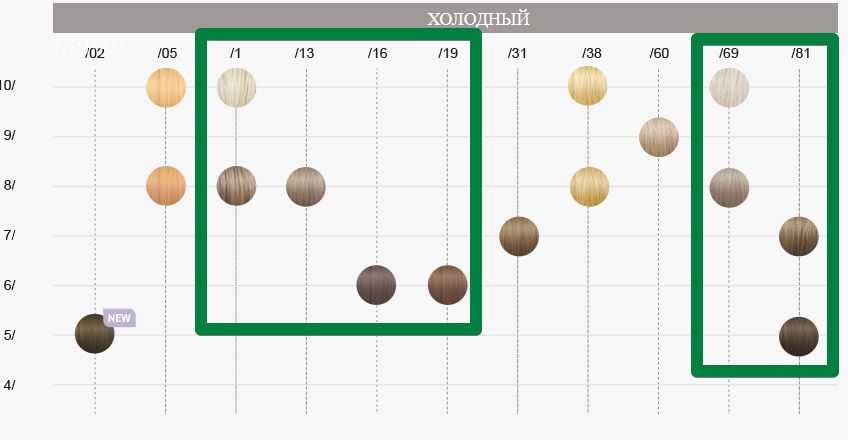 Например, для русо-пепельного необходимо выбрать краситель с первой цифрой 7 или 8 и пепельным направлением, к примеру 7/1.