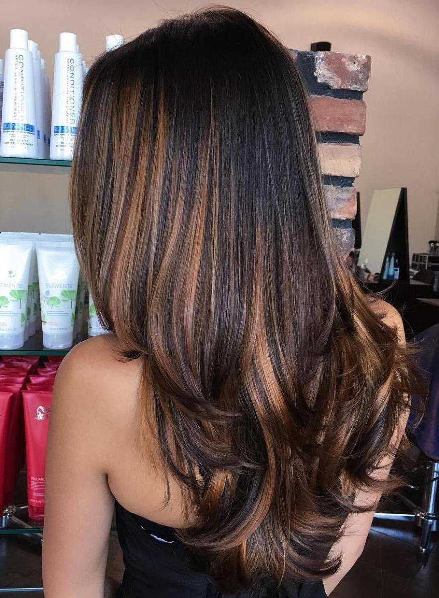 Черный цвет волос можно осветлить в технике балаяж до каштанового, шоколадного или кофейного оттенка. Как всегда, осветлять рекомендуется прядями.