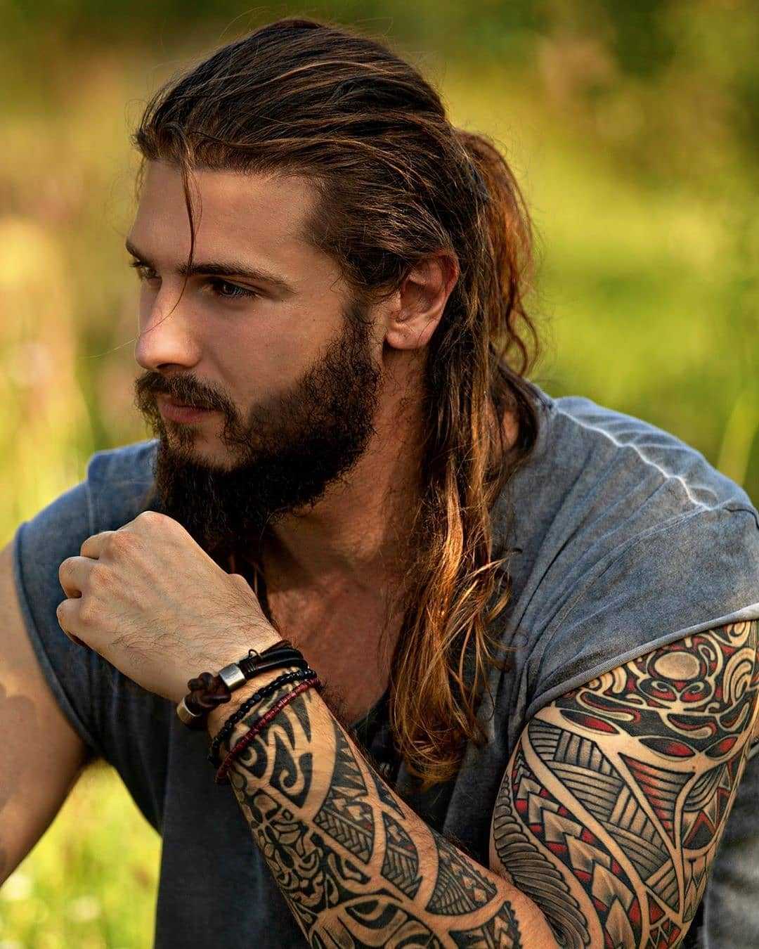 Это очень старая, очень востребованная и элегантная мужская причёска. Просто аскетично собрав длинные волосы в хвост, вы будете строги и элегантны одновременно. Такой хвост очень хорошо смотрится с бородой.