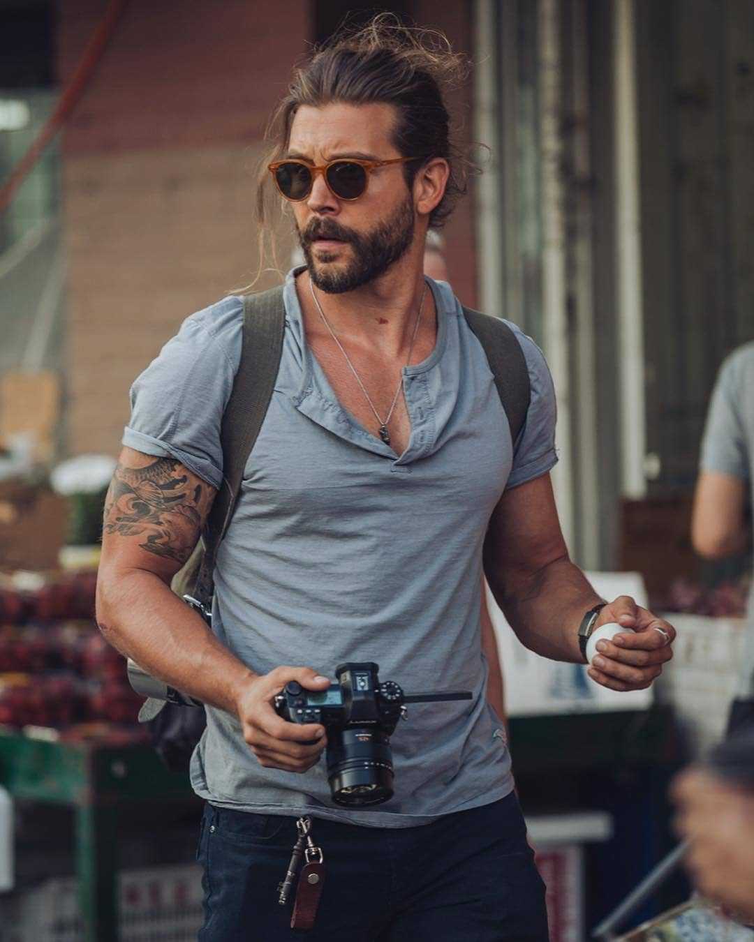 Топ кнот. Пожалуй, одна из лучших мужских причесок с длинными волосами, в которой легко сочетаются комфорт и неординарность. Прядки с макушки, собранные в тугой пучок, эффектно подчеркивают выбритые практически под ноль виски, при этом все, что требуется для укладки – 2-3 минуты свободного времени, расческа и тоненькая резинка