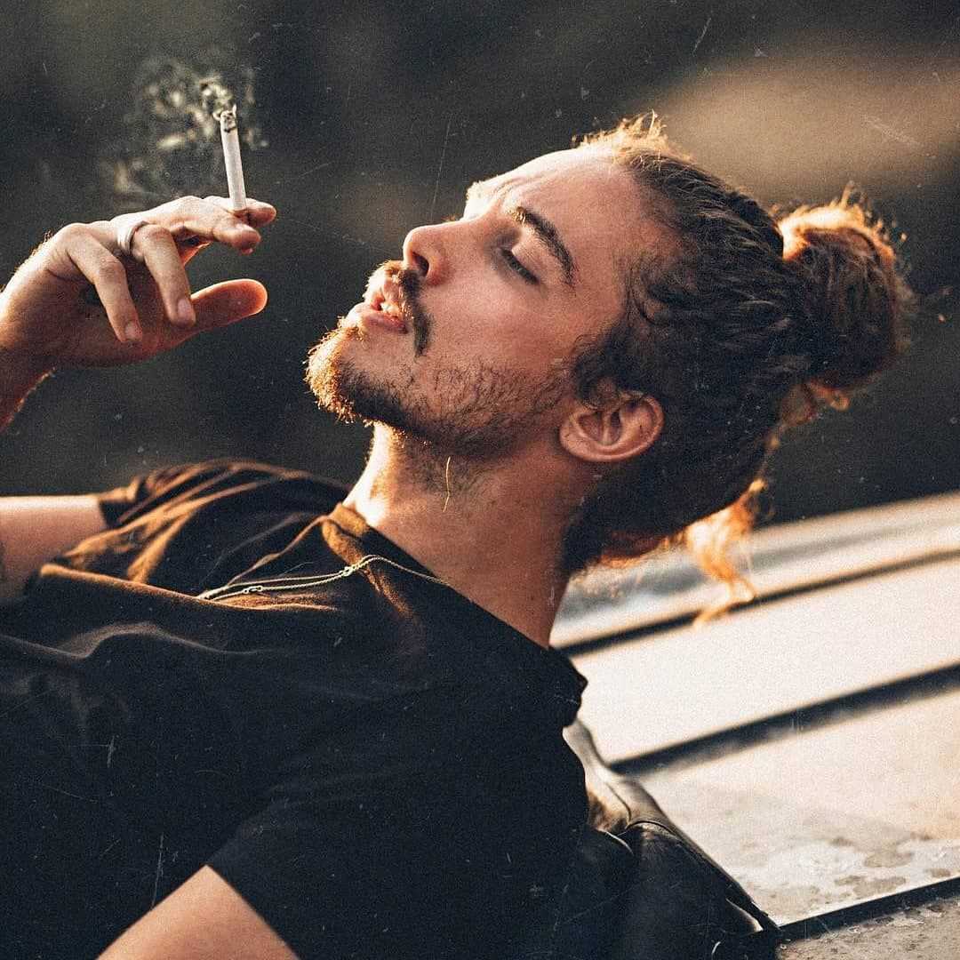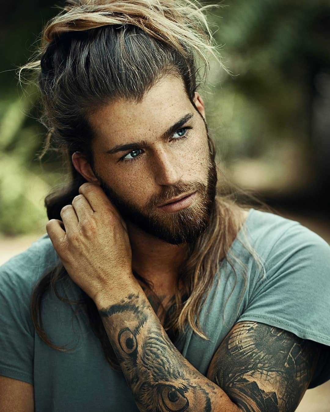 Бан. Хипстерская мужская стрижка с длинными волосами как минимум до лопаток, которые обычно завязывают в хвост. Прядки можно зачесывать назад либо сделать пробор, дополнить асимметричной челкой или выпустить несколько локонов у висков, чтобы подчеркнуть скулы и визуально вытянуть овал лица.