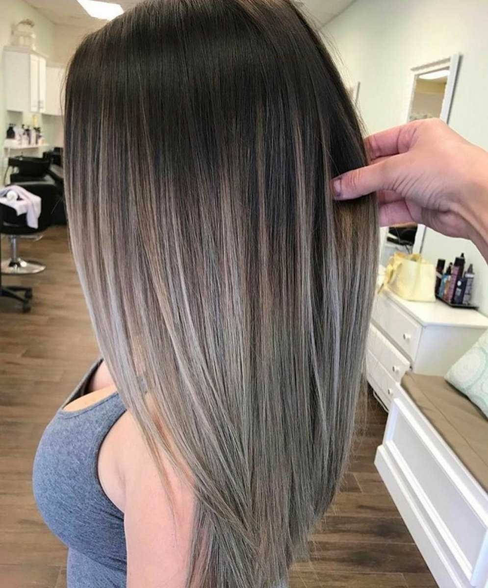 Интересно украшает длинные пряди техника «соль и перец». Она требует обесцвечивания шевелюры для создания пепельно-графитовых колеров. Лучше всего подойдет холодному цветотипу, и идеально – для маскировки седины.