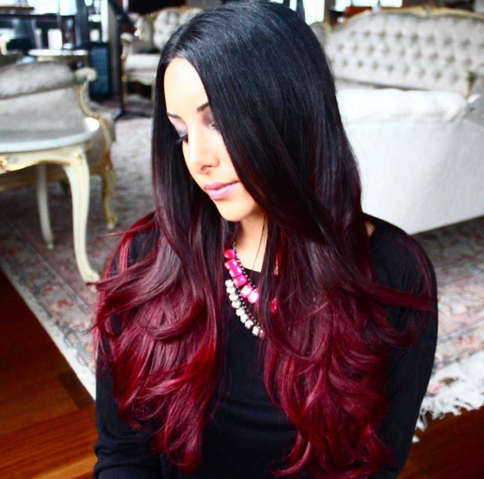 Еще два варианта окрашивания для брюнеток — омбре в ярких красках. В первом случае выбран винный оттенок, во втором — баклажан.